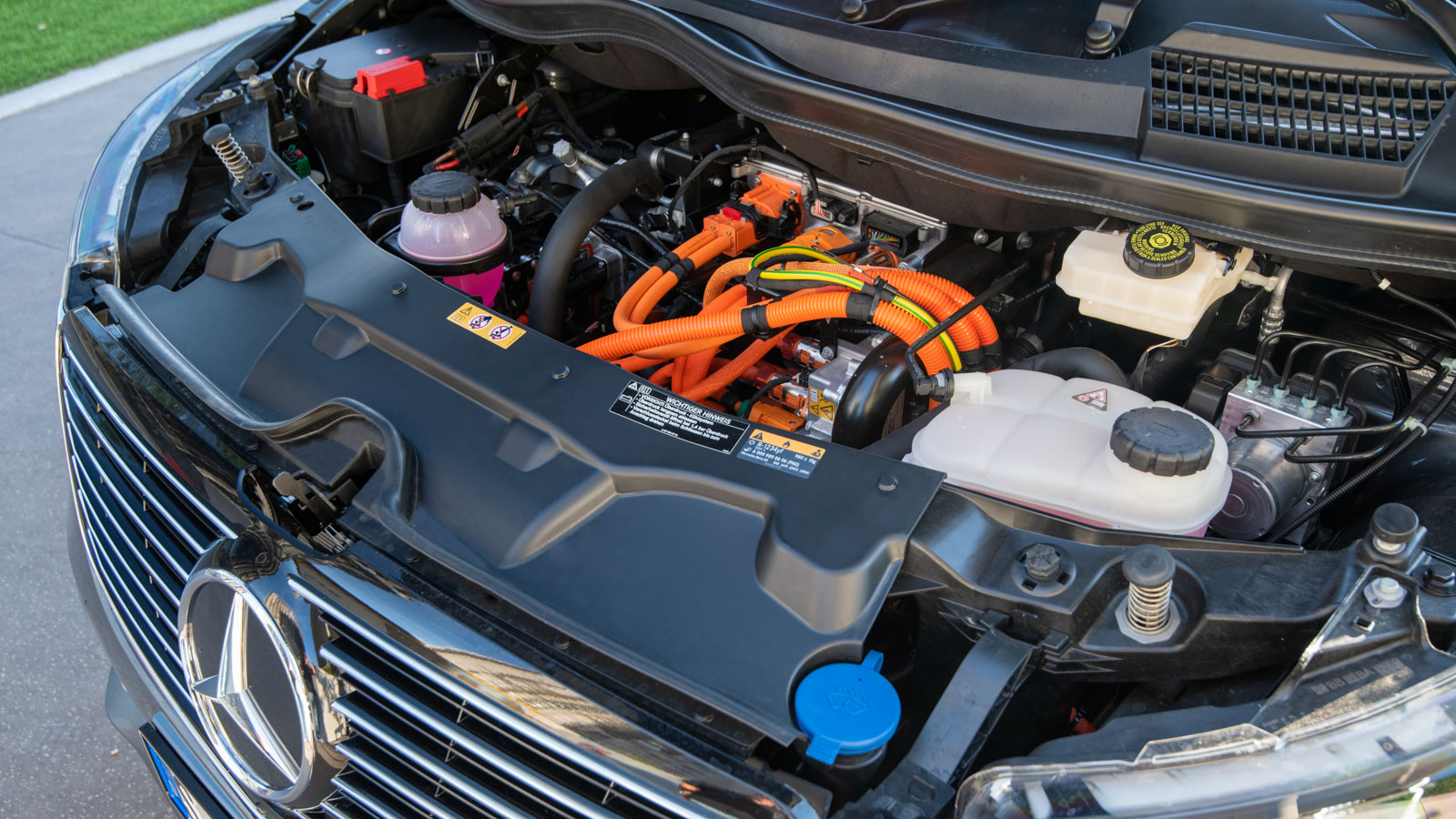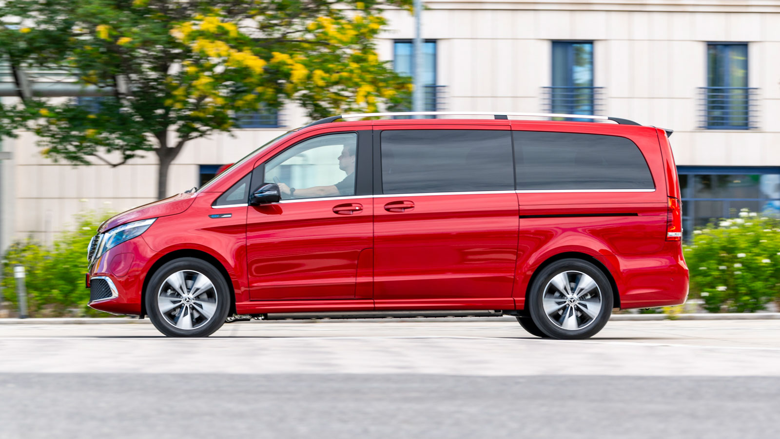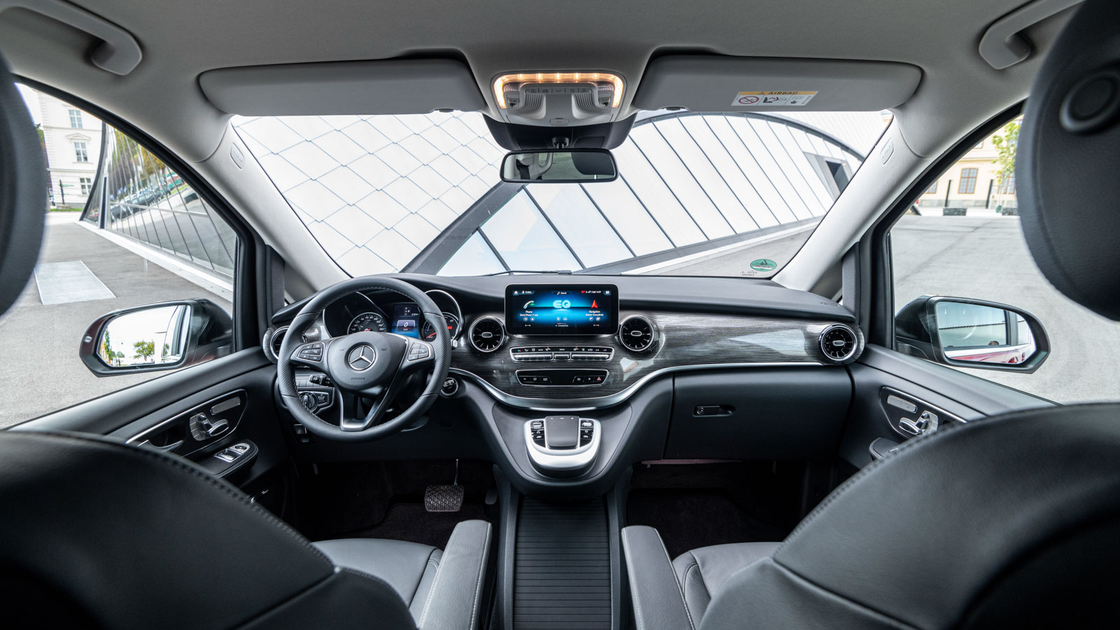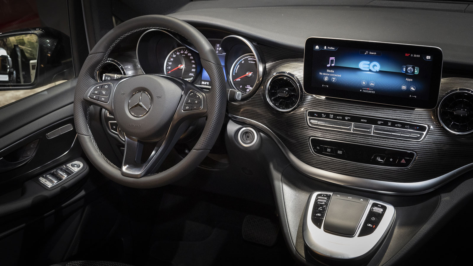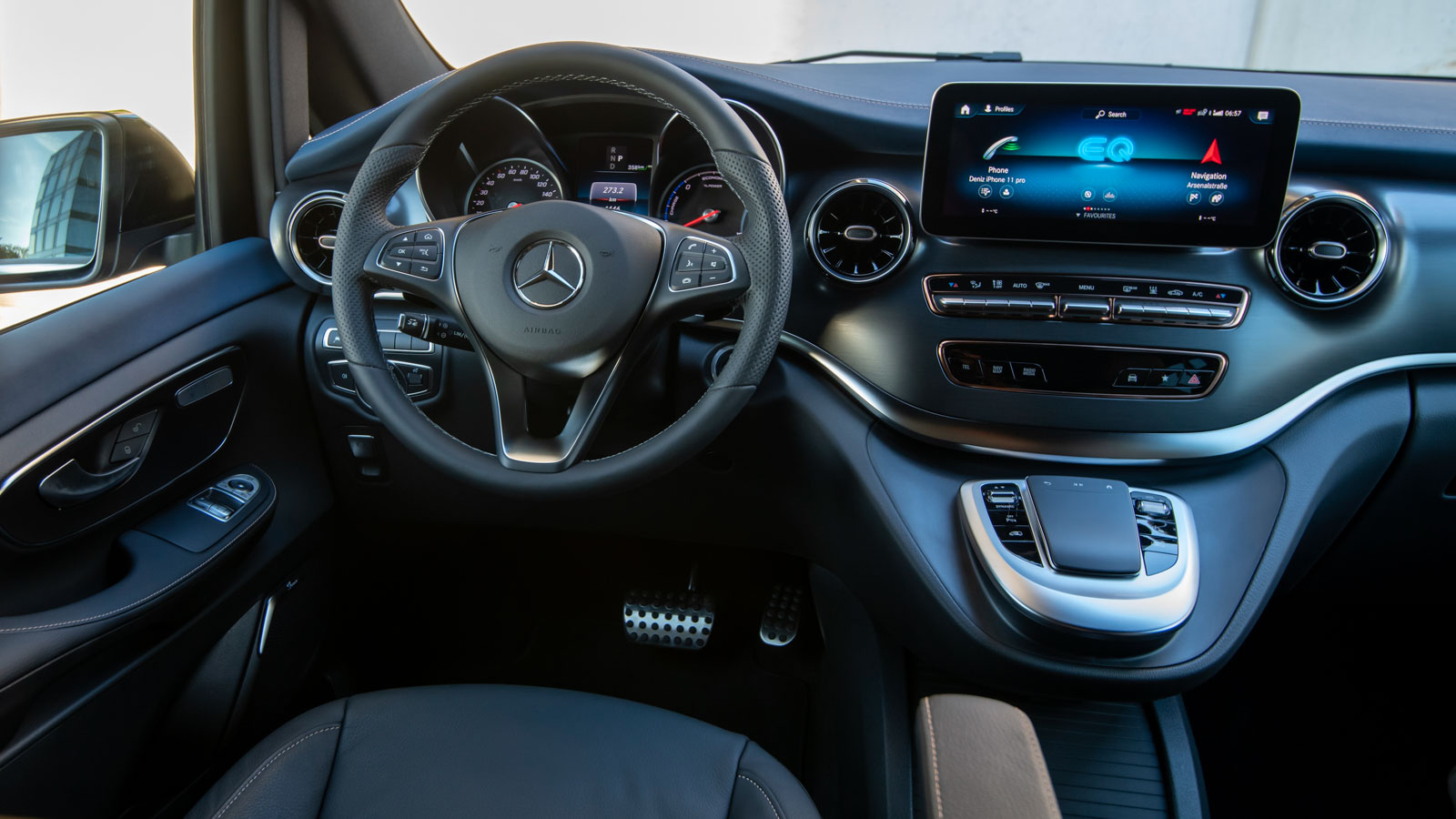 Además de la amplitud, el EQV es un coche confortable y bien acabado. Cuenta, como otros modelos de la marca, con la posibilidad de un salpicadero con grandes pantallas horizontales, que dan información del cuadro de relojes y la pantalla multimedia. La posición de conducción, y de viaje de los pasajeros, es muy erguida, aunque los respaldos tienen regulaciones en inclinación. Puede montar mesita plegable (855 €), consola central con compartimento refrigerado (3.000 €), argollas para sujetar la carga o, incluso, el asiento se puede convertir en cama (1.290 €).