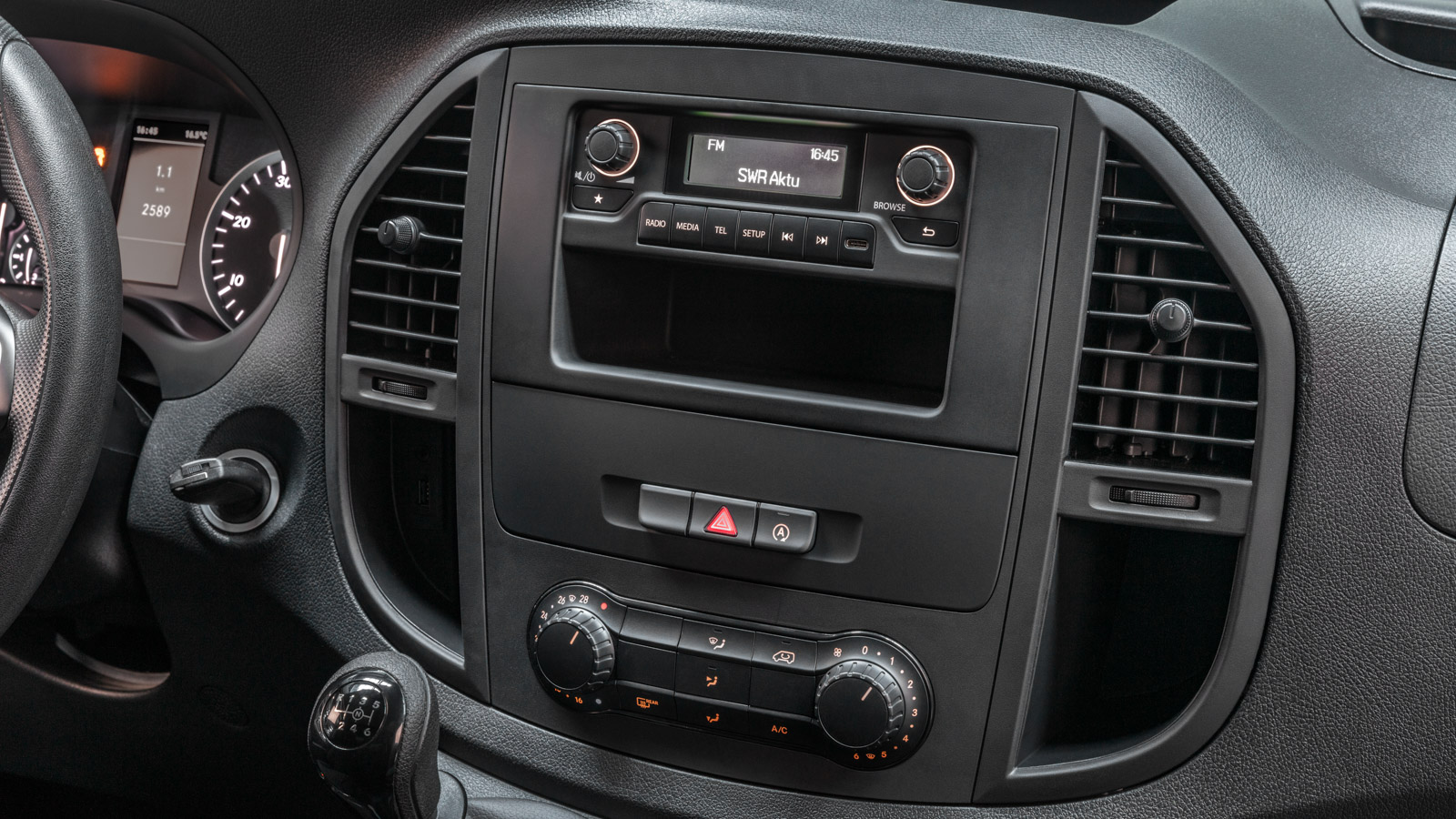 El Mercedes-Benz Vito Furgón cuenta con Apple CarPlay y Android Auto desde el acabado básico y puede montarun sistema multimedia muy completo con pantalla digital. El cuadro de instrumentos combina diales analógicos con un display digital para el ordenador de viaje.