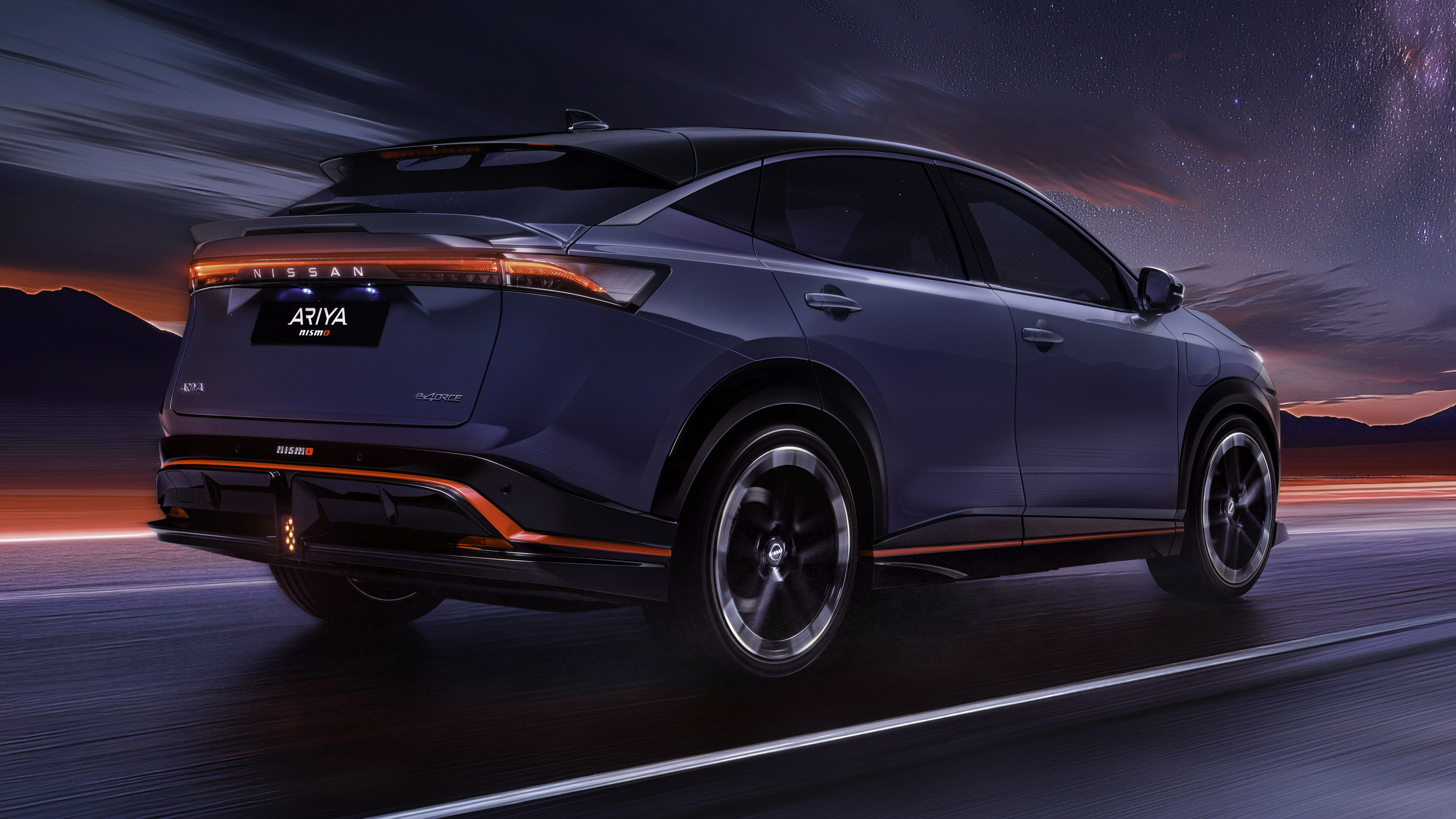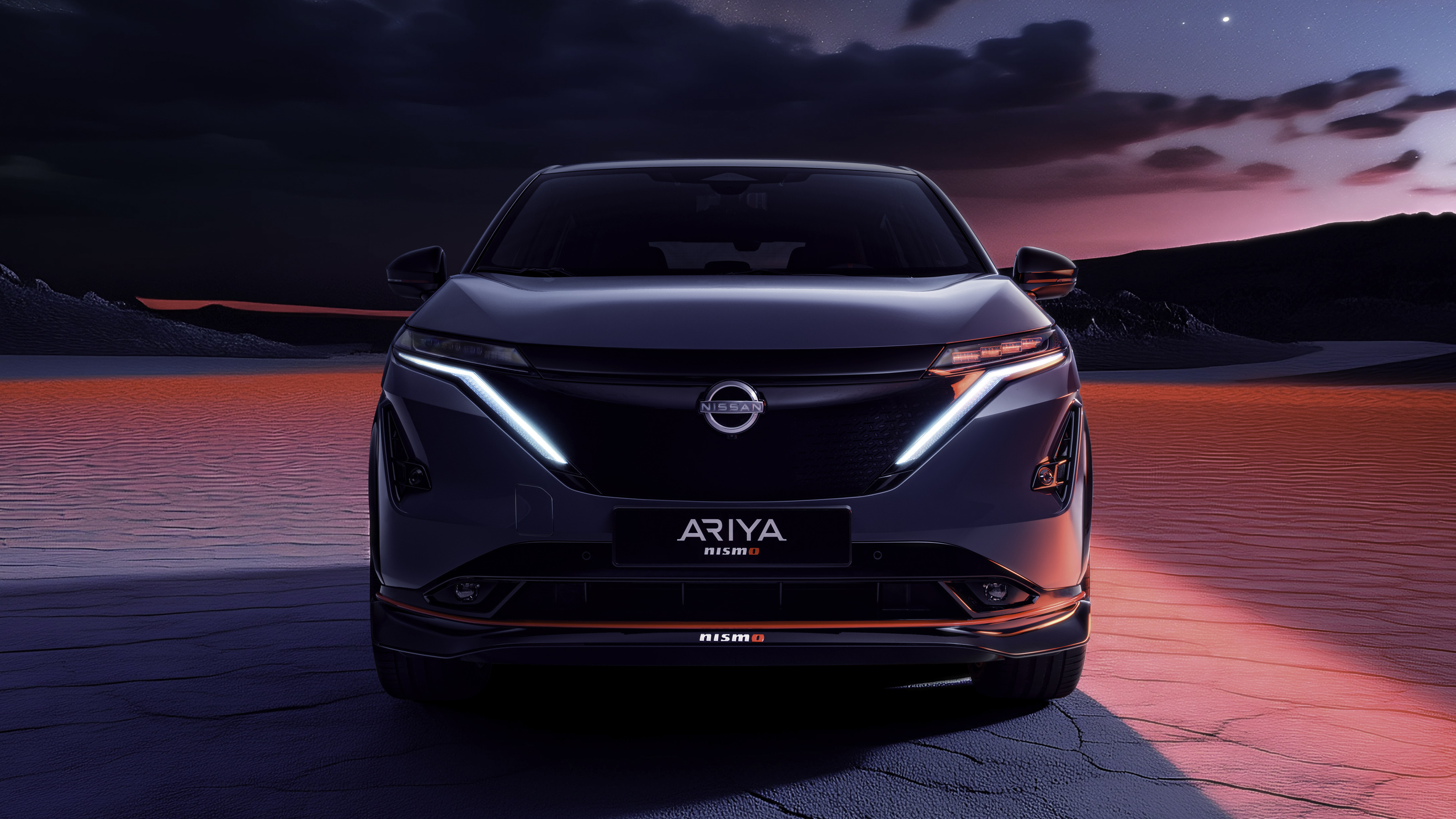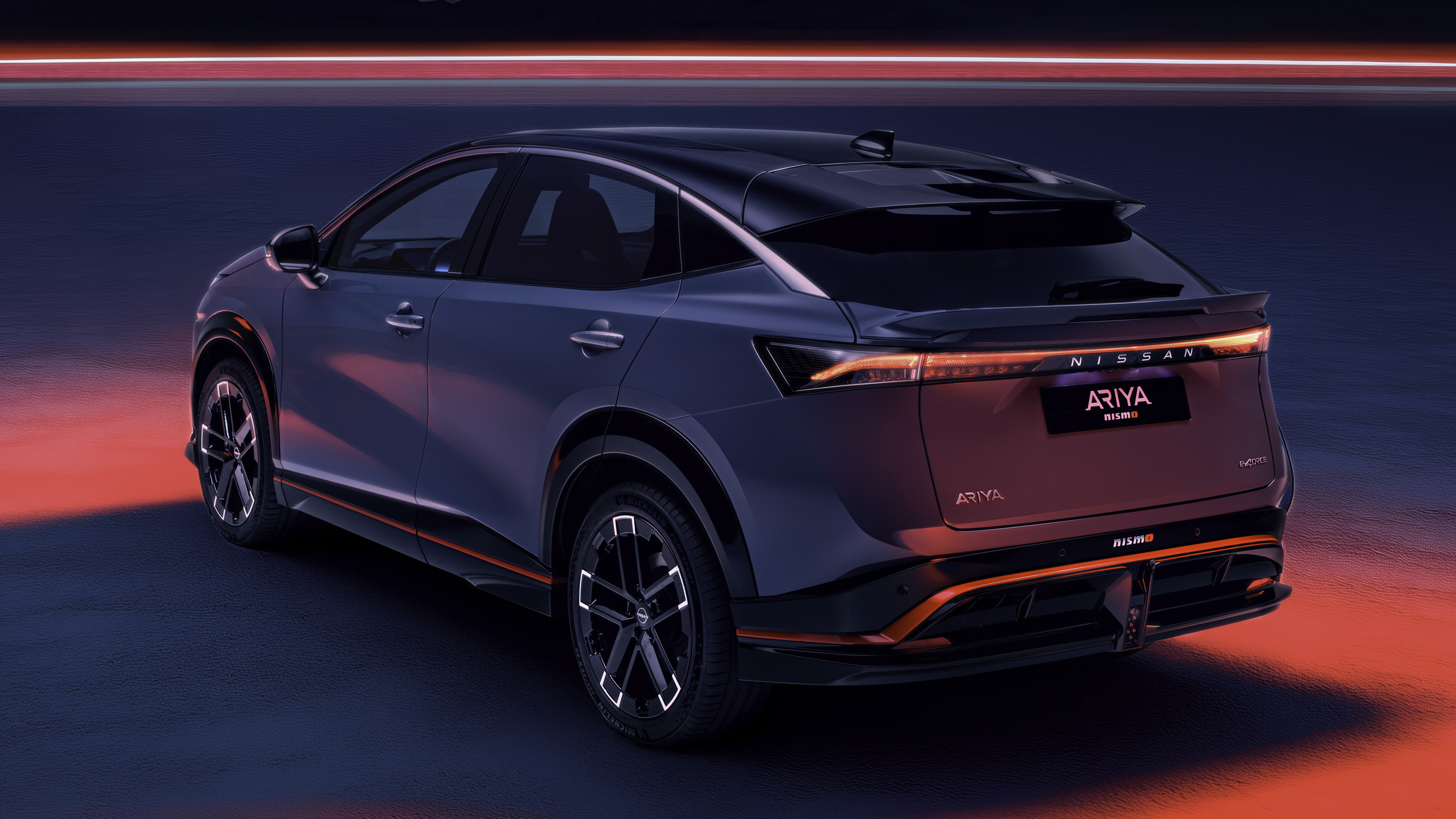 El Nissan Ariya NISMO es la versión más deportiva del SUV eléctrico de Nissan. Va pintado en color NISMO Grey con detalles en rojo. Cuenta con el sistema de tracción e-4ORCE y una batería de 87 kWh, y pasa de 0 a 100 km/h en 5 segundos. Tiene una suspensión más firme y enérgica. En el interior, el Ariya NISMO combina asientos con tapicería exclusiva y la iluminación roja ANDON, que crea una atmósfera más deportiva.