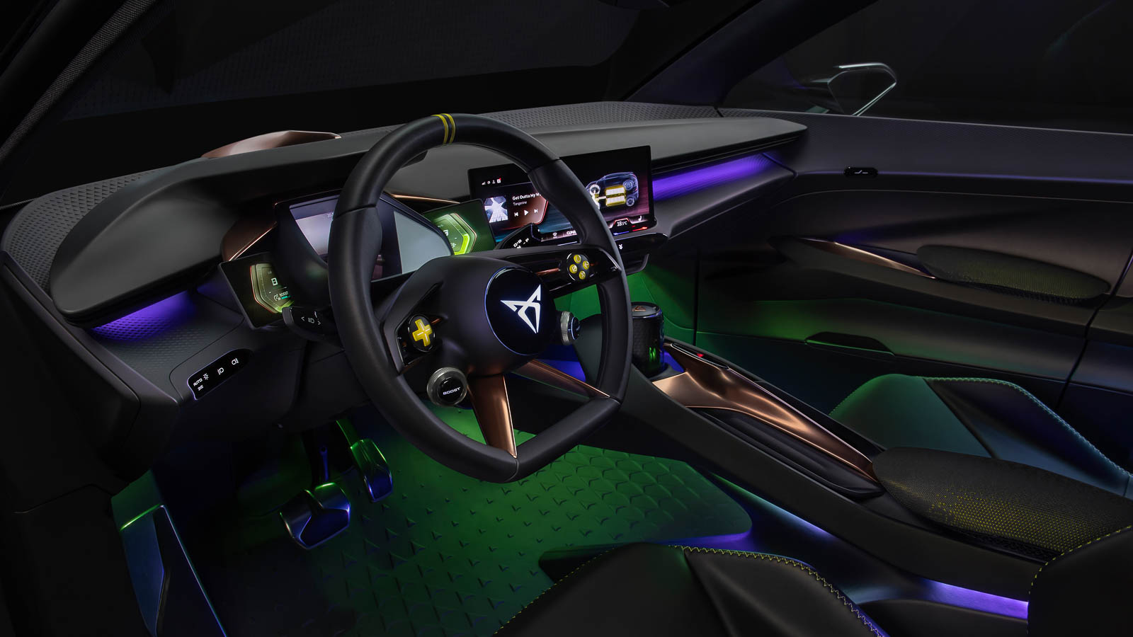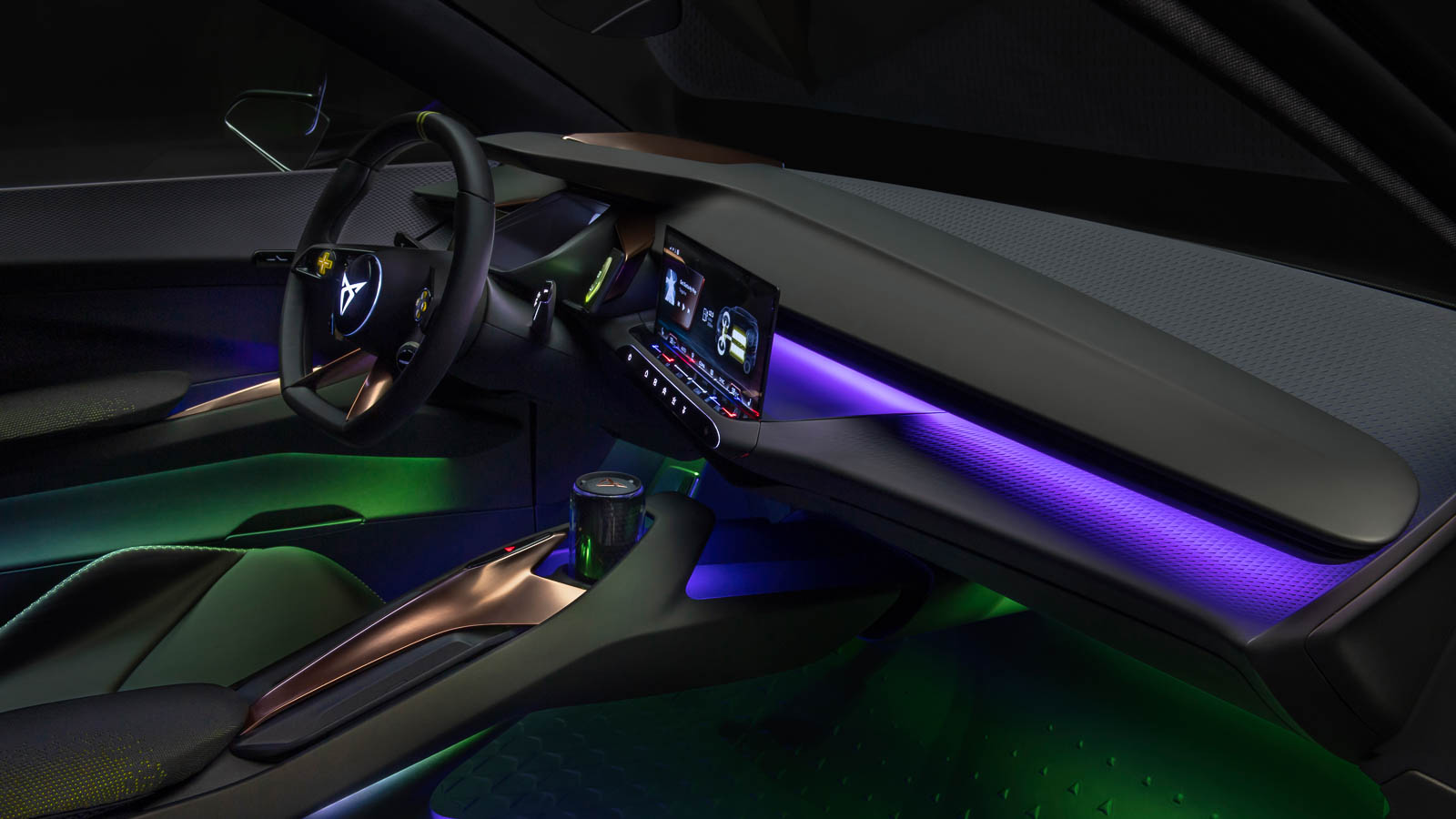 En el interior hay más detalles de diseño novedosos o que aportan soluciones ideadas por CUPRA. La más llamativa es el sistema de proyección de la información en el parabrisas, que abarca un campo de visión de unos 180º gracias a que se extiende a las ventanillas delanteras. Cuando se ofrezca como equipamiento, la altura que ocupe frente al conductor será menor que en el prototipo para robar menos campo de visión al circular. Está diseñado para mostrar multitud de información tanto de navegación, como de asistencia. Es más sofisticado que el que ofrece Volkswagen en el ID.4.