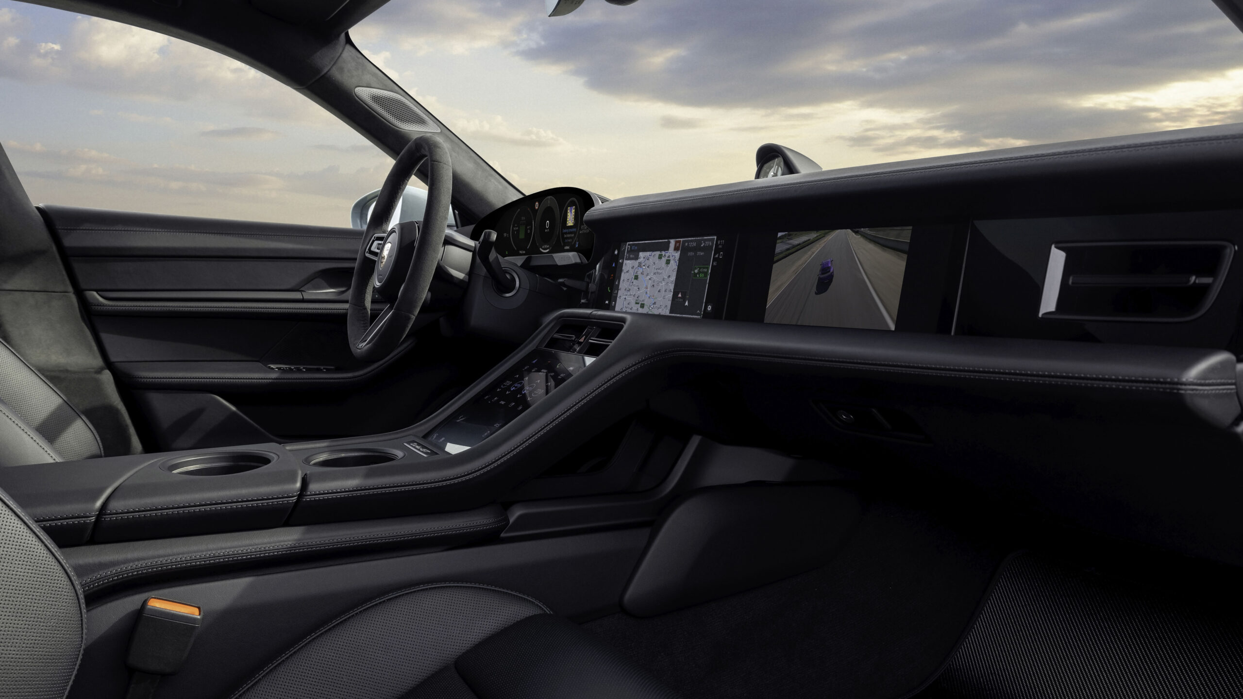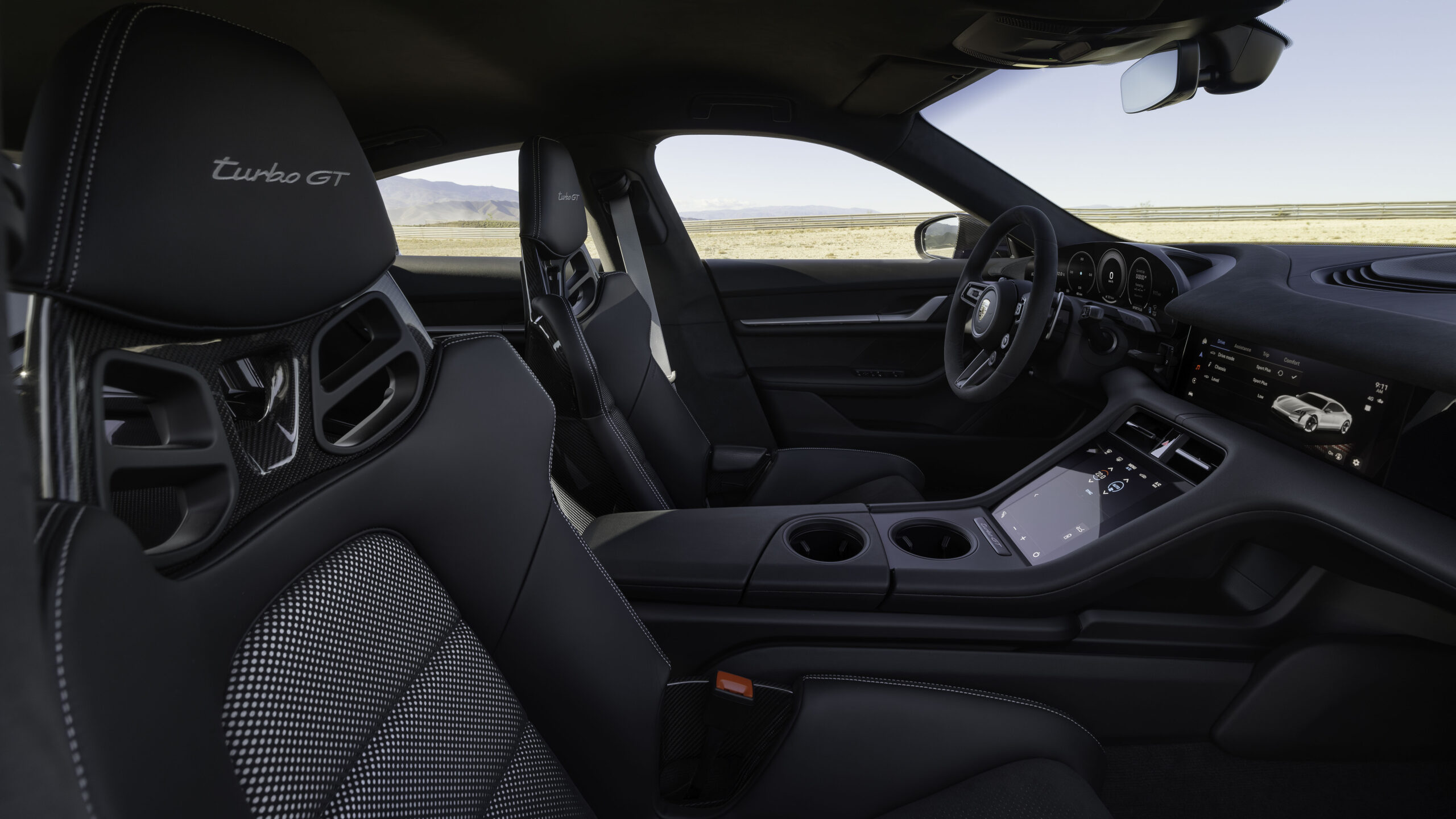 En el interior, el Taycan Turbo GT ofrece asientos tipo baquet con una estructura fabricada en CFRP (plástico reforzado con fibra de carbono), tapizados con una mezcla del tejido que Porsche denomina Race-Tex y cuero negro. Los asientos adaptativos deportivos Plus están disponibles como opción sin coste adicional. El paquete Sport Chrono conlleva el volante GT con una marca en color a las 12 en punto. El ambiente interior se puede personalizar con tonos en contraste en colores Volt Blue o GT Silver.