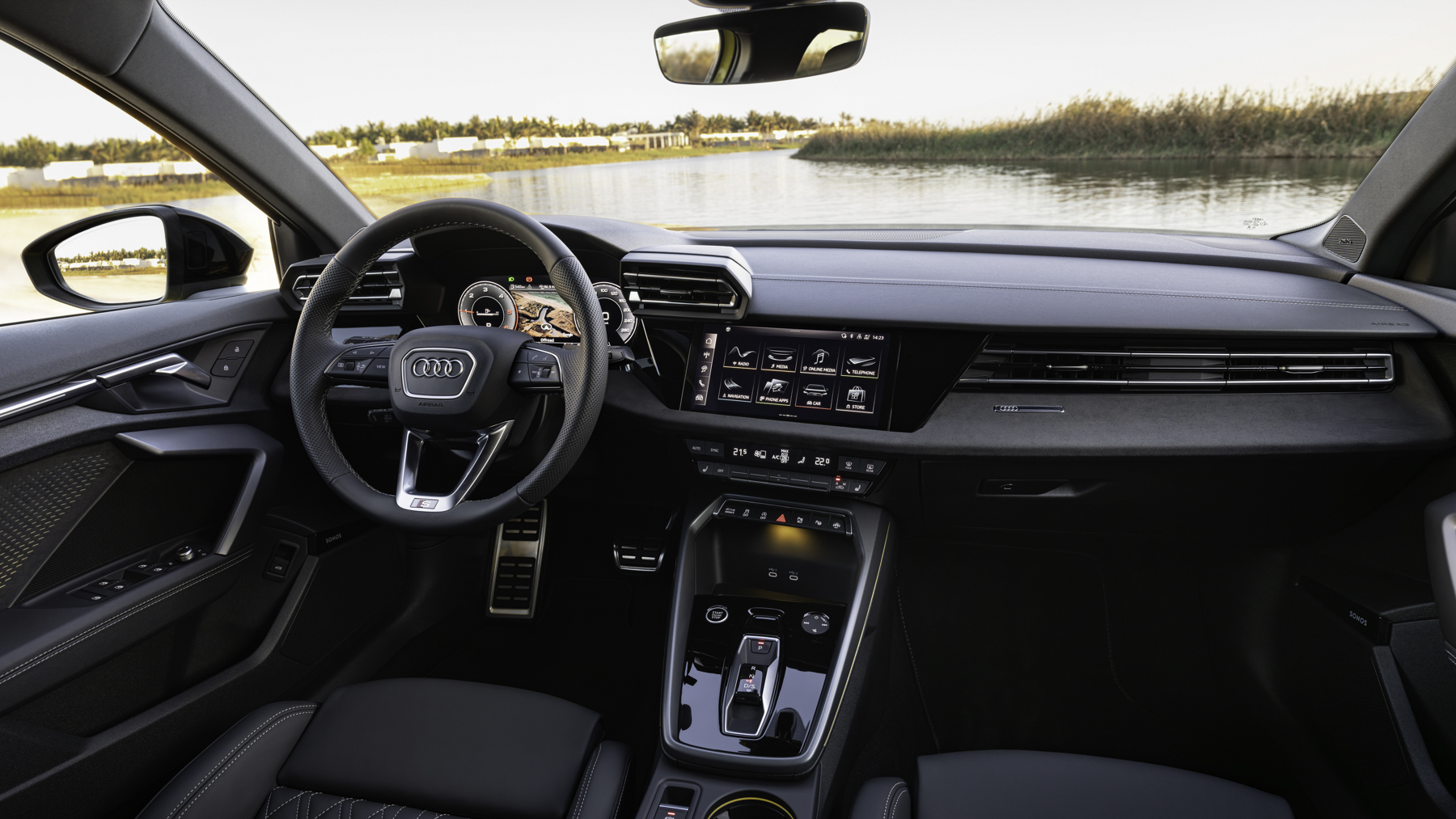 El A3 2024 recibe mejoras en conectividad y asistencia al conductor. Básicamente gracias a la integración de apps y funciones bajo demanda a través de Audi connect y una tienda online, todo operable a través de la pantalla táctil multimedia de 10,1 pulgadas. Elementos como el Audi virtual cockpit, un cargador inductivo para teléfonos móviles y múltiples puertos USB-C, ya existentes antes, se complementan con opciones como el MMI Navegación plus y Amazon Alexa. La seguridad corre a cargo del sistema Audi pre sense front, que aúna las principales ayudas al conductor y que incorpora el asistente de crucero adaptativo con función de cambio de carril (ahora funciona a velocidades de entre 90 y 210 km/h), el asistente de frenada de emergencia, el asistente de giro y el sistema de advertencia de abandono involuntario de carril.