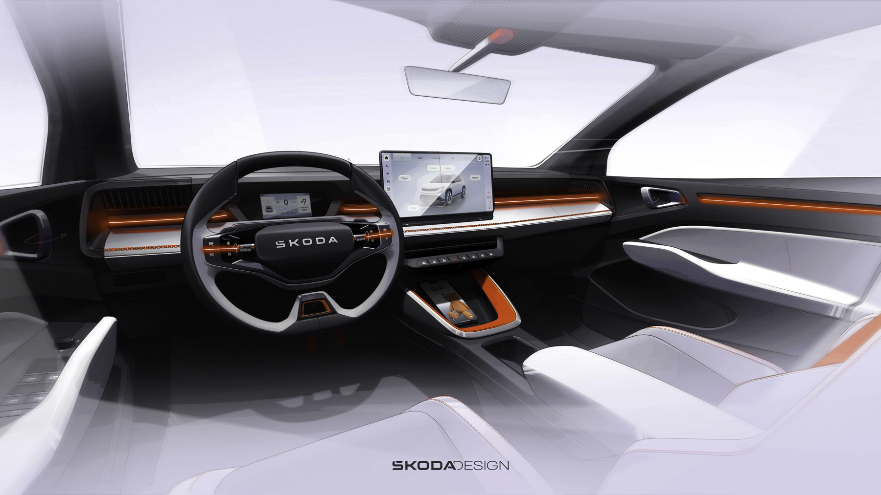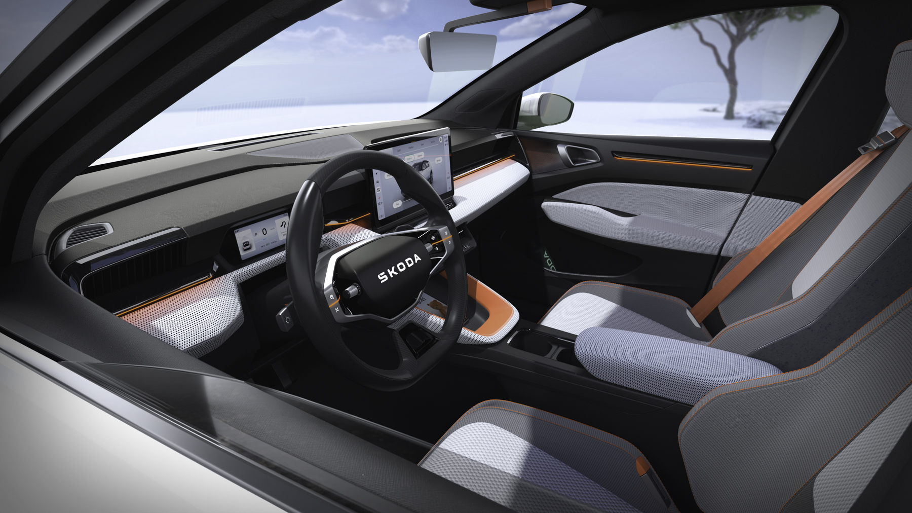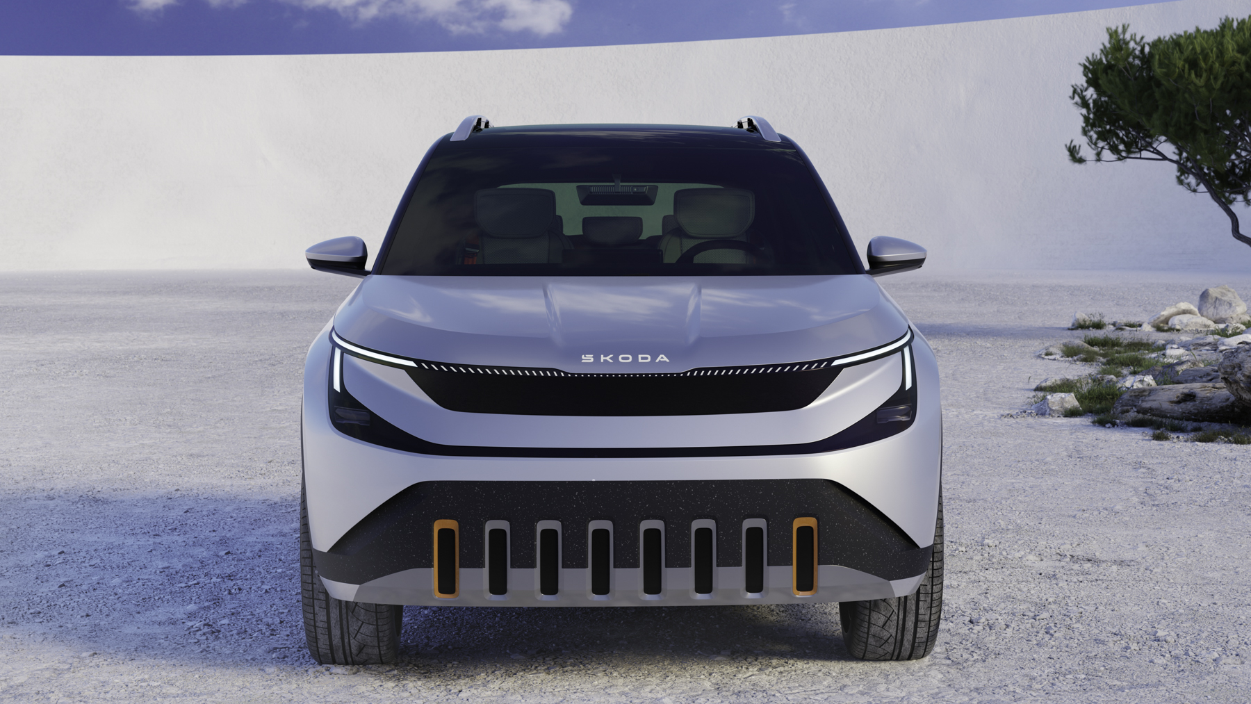 Cuando llegue el modelo de producción, el Skoda Epiq, basado en este prototipo digital que observas en las fotos, será un nuevo SUV urbano eléctrico de peuqeño tamaño. Skoda ha llamado al estilo que con el que lo presenta “lenguaje de diseño Modern Solid”, en el que combina elementos robustos y funcionales con el toque suficiente de sofisticación. El capó está pintado en negro brillante, los faros cuentan con tecnología Matrix LED y la silueta del coche destaca por una línea de techo baja, el alerón posterior y ciertos detalles en naranja y pintura en Blanco Luna brillante.
