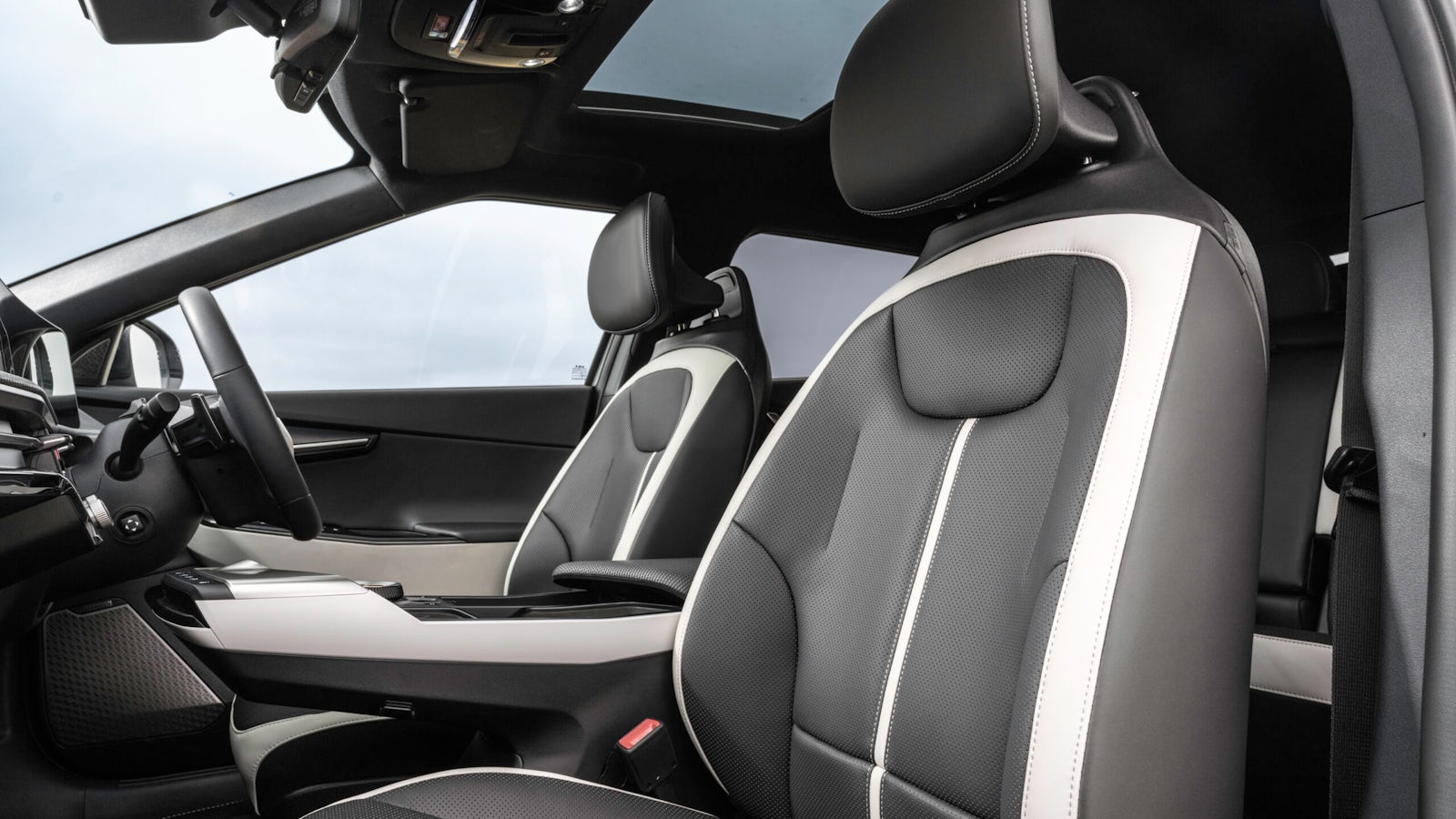 - Asientos en ante negro con refuerzos en cuero artificial blanco, además de asientos traseros exteriores calefactados y asientos delanteros ventilados.