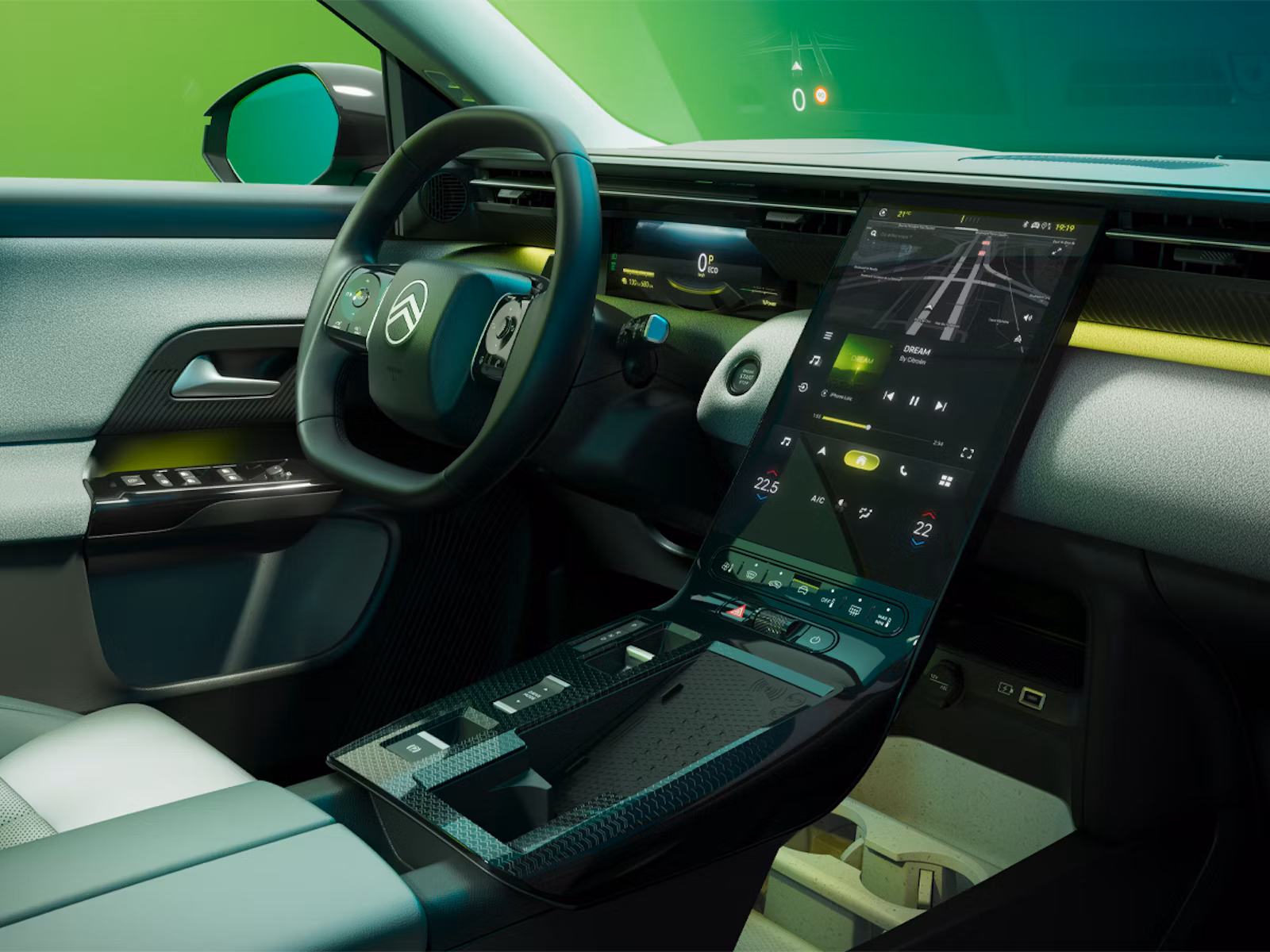 La mayoría de los controles físicos de climatización han sido sustituidos por el sistema táctil, aunque se mantienen algunos accesos directos en la parte inferior. También hay espacio de almacenamiento bajo la pantalla, donde se encuentran los portavasos.