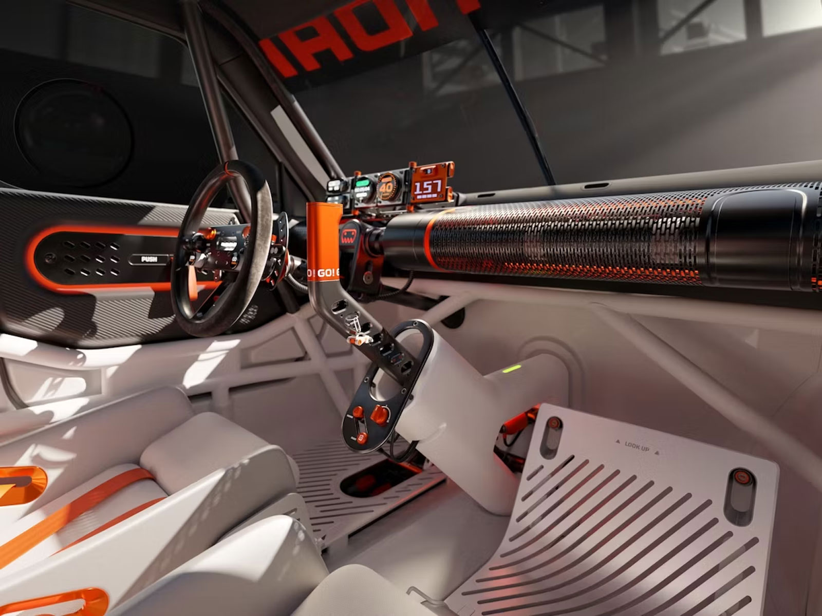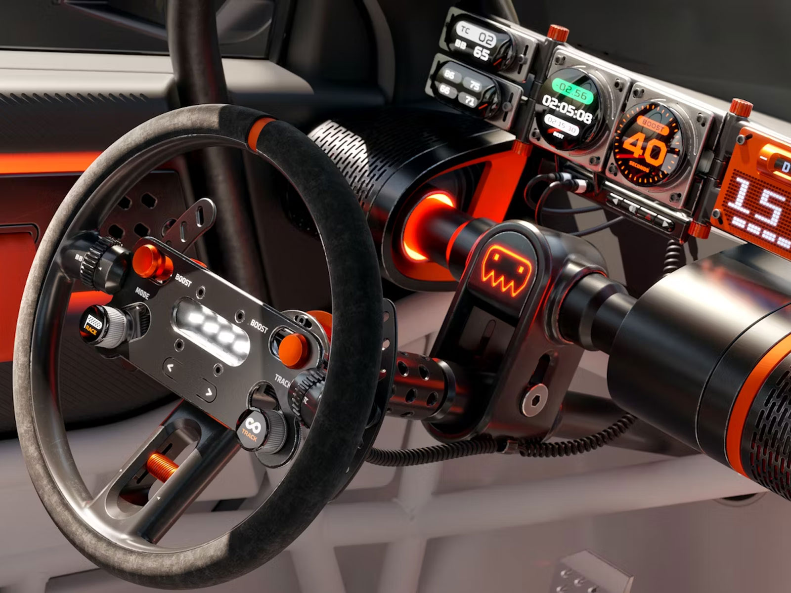Dentro del Insteroid no queda nada del interior funcional del Hyundai Inster de serie. El salpicadero ha sido sustituido por una pantalla digital de estilo minimalista, con botones inspirados en los coches de competición.