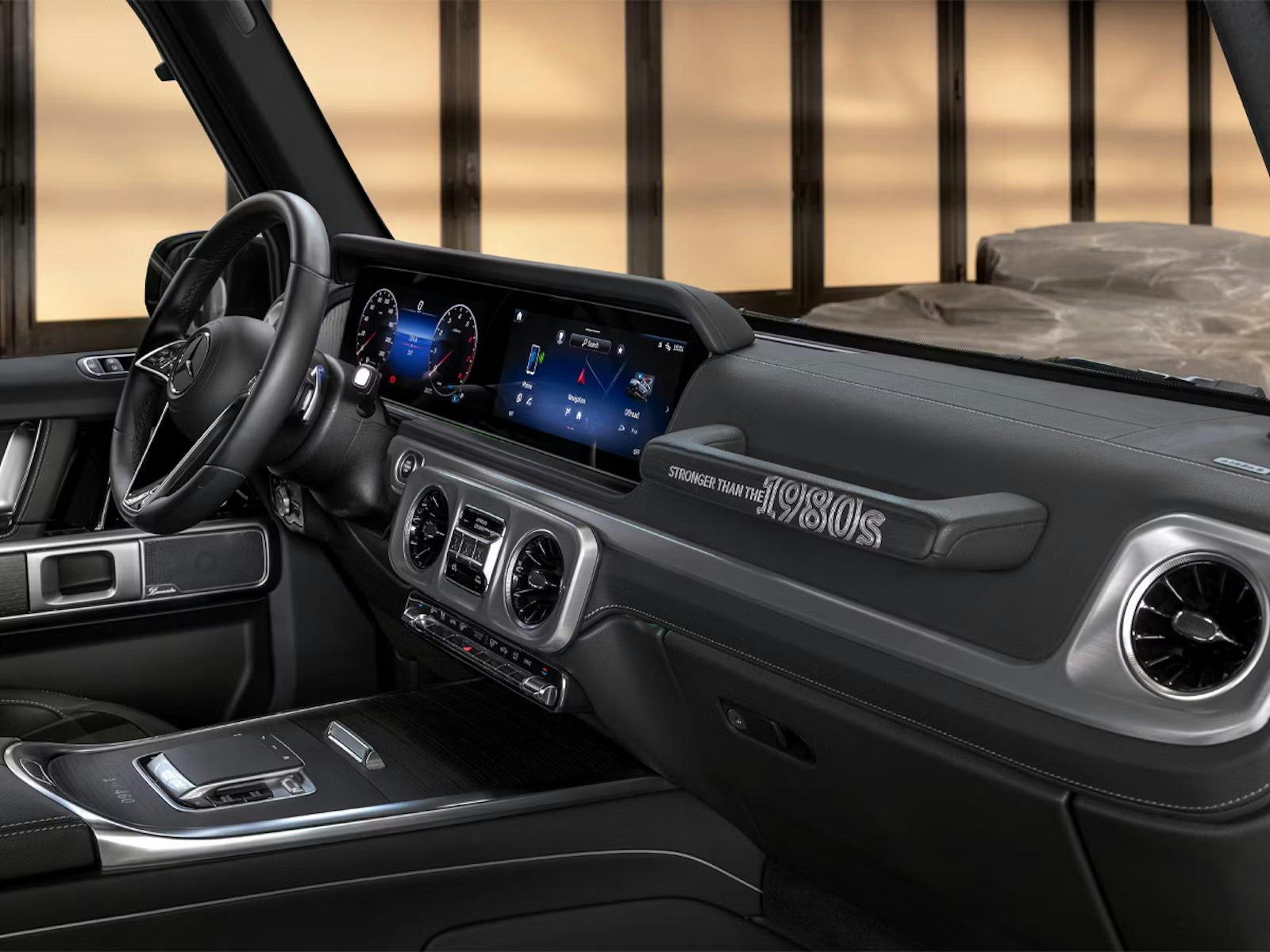 Por dentro también hay detalles únicos que rinden homenaje a la historia del G. Lo más llamativo son los asientos con tapicería a cuadros gris, un claro guiño al modelo original. En el salpicadero, la clásica barra de agarre del copiloto lleva grabado el eslogan “Stronger than the 1980s” y la inscripción “1 of 460” te recuerda lo exclusivo que es tu coche.