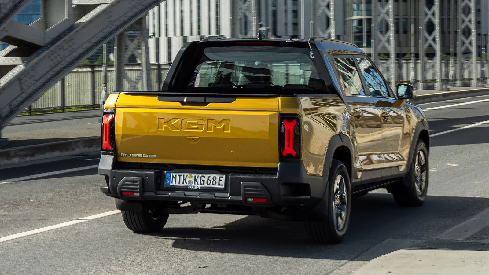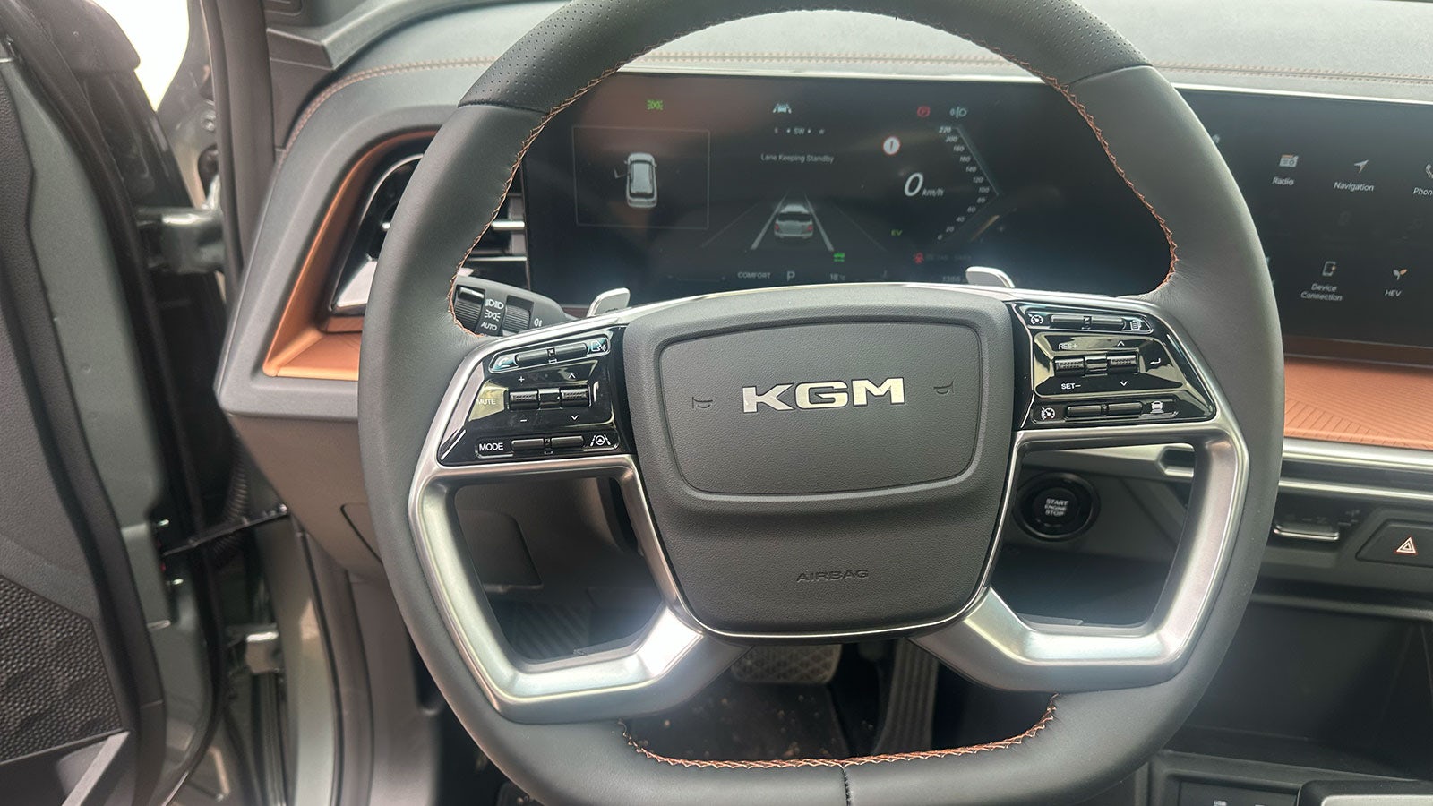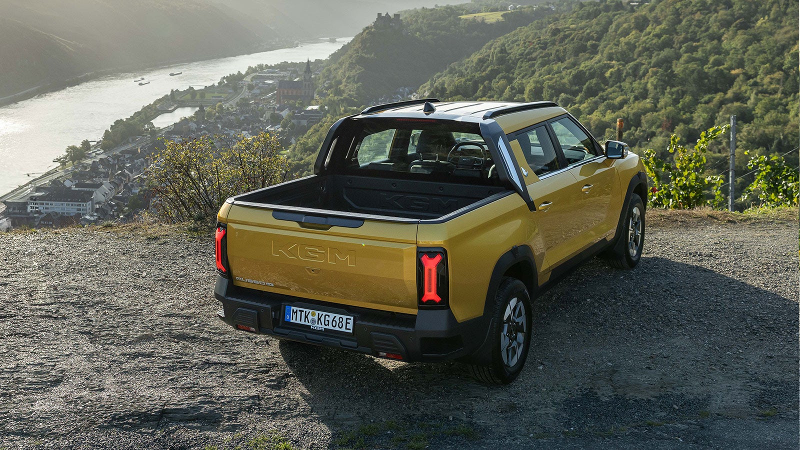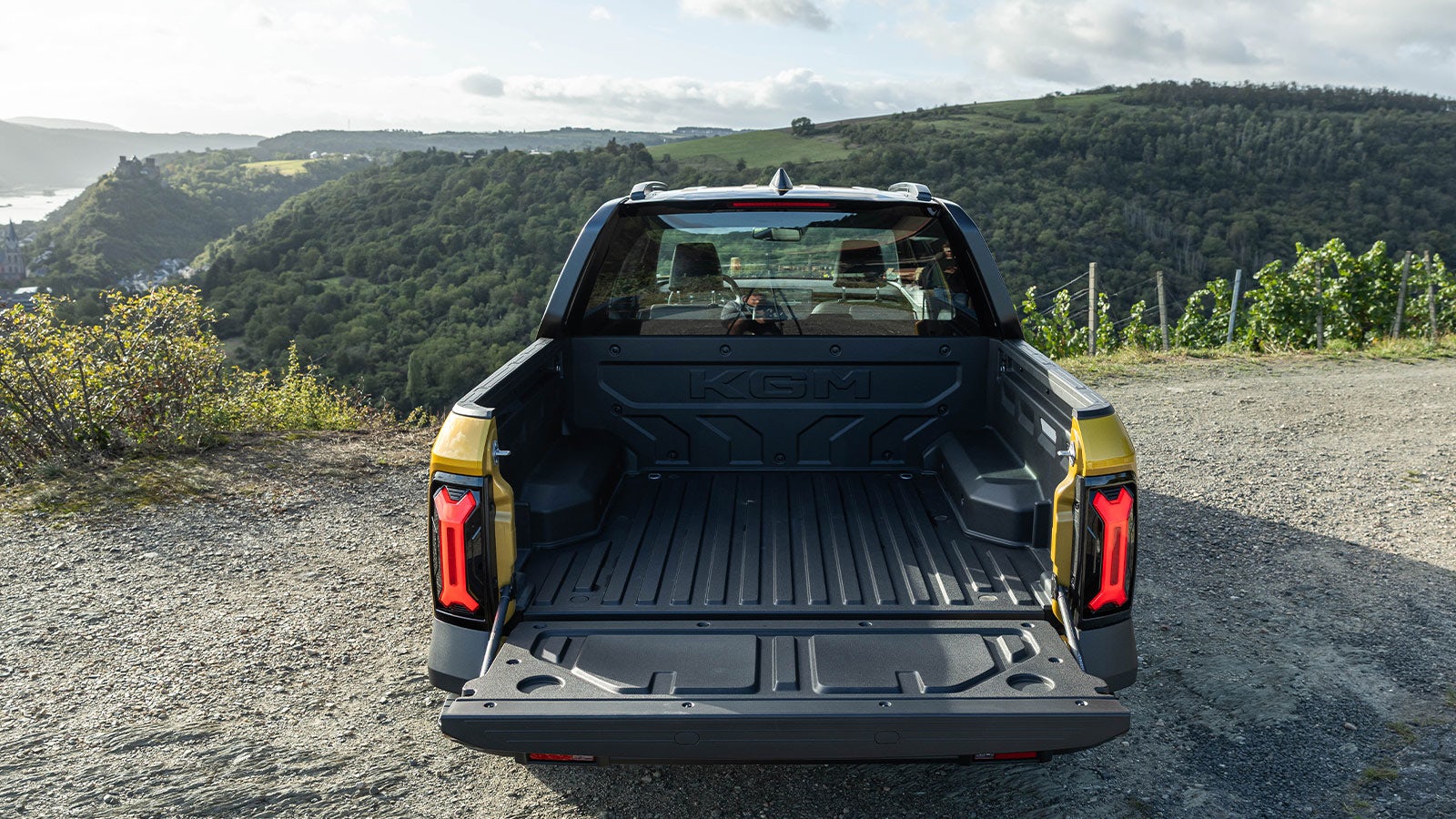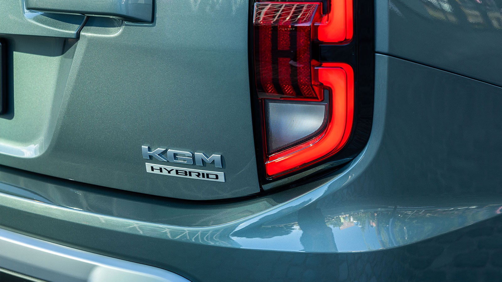 El diseño exterior tiene un aspecto robusto, con líneas cuadradas al más puro estilo 4×4, aunque lo combina con elementos más modernos, como una parrilla negra minimalista, faros LED de doble proyector y pasos de rueda marcados. La parte trasera incluye un gran emblema KGM troquelado en la puerta de la caja y ópticas LED de estilo industrial.
