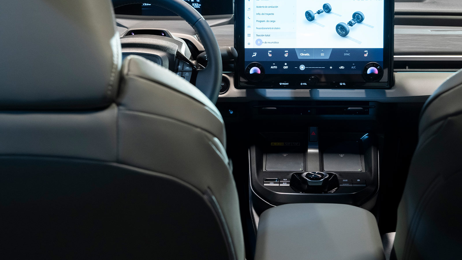 Los materiales son sostenibles, con tapicerías en cuero o ante sintético elaboradas con tejidos reciclados (PET). La iluminación ambiental configurable en 64 colores, el techo panorámico y los asientos calefactables completan una atmósfera premium.