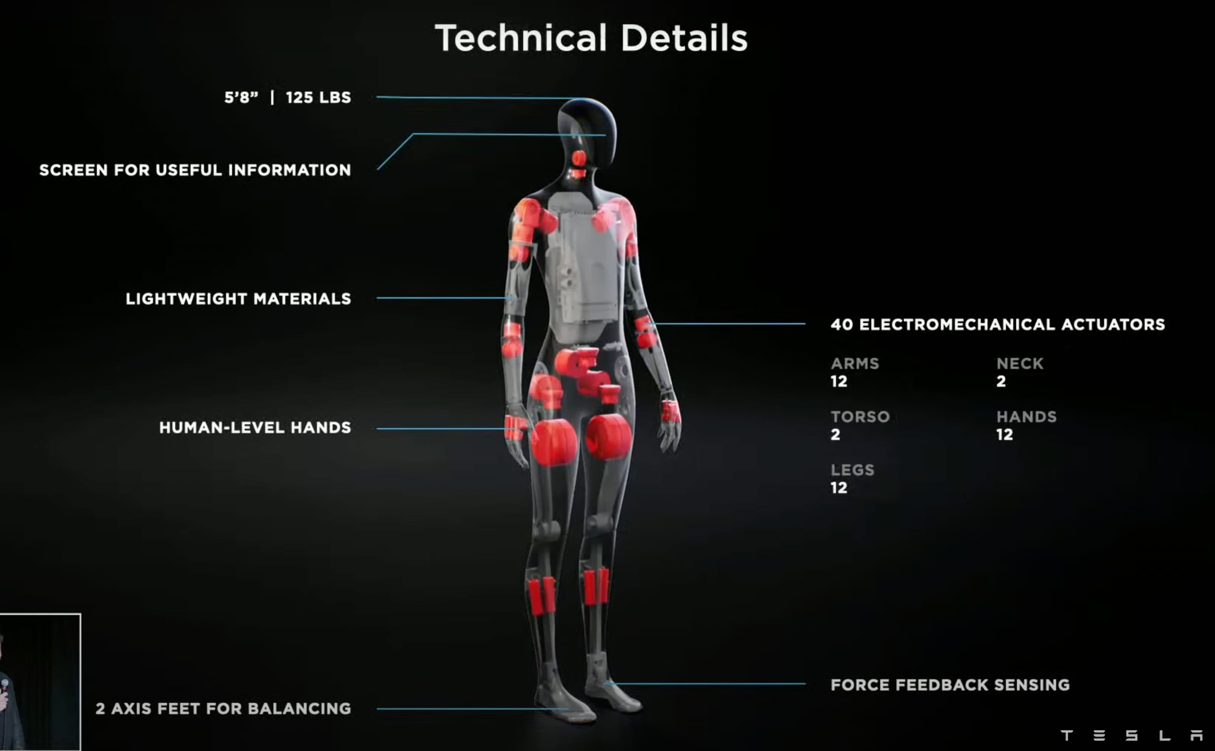 Optimus mide alrededor de 1,73 metros, pesa unos 56 kilos y está equipado con sensores derivados del sistema de conducción autónoma de Tesla. Su objetivo es funcionar como un robot de propósito general, capaz de trabajar tanto en fábricas como en entornos domésticos. Está construido con materiales ligeros para facilitar el equilibrio y la eficiencia energética. Dispone de 40 actuadores electromecánicos distribuidos en distintas zonas del cuerpo: 12 en los brazos, 12 en las piernas, 12 en las manos, 2 en el cuello y 2 en el torso.
