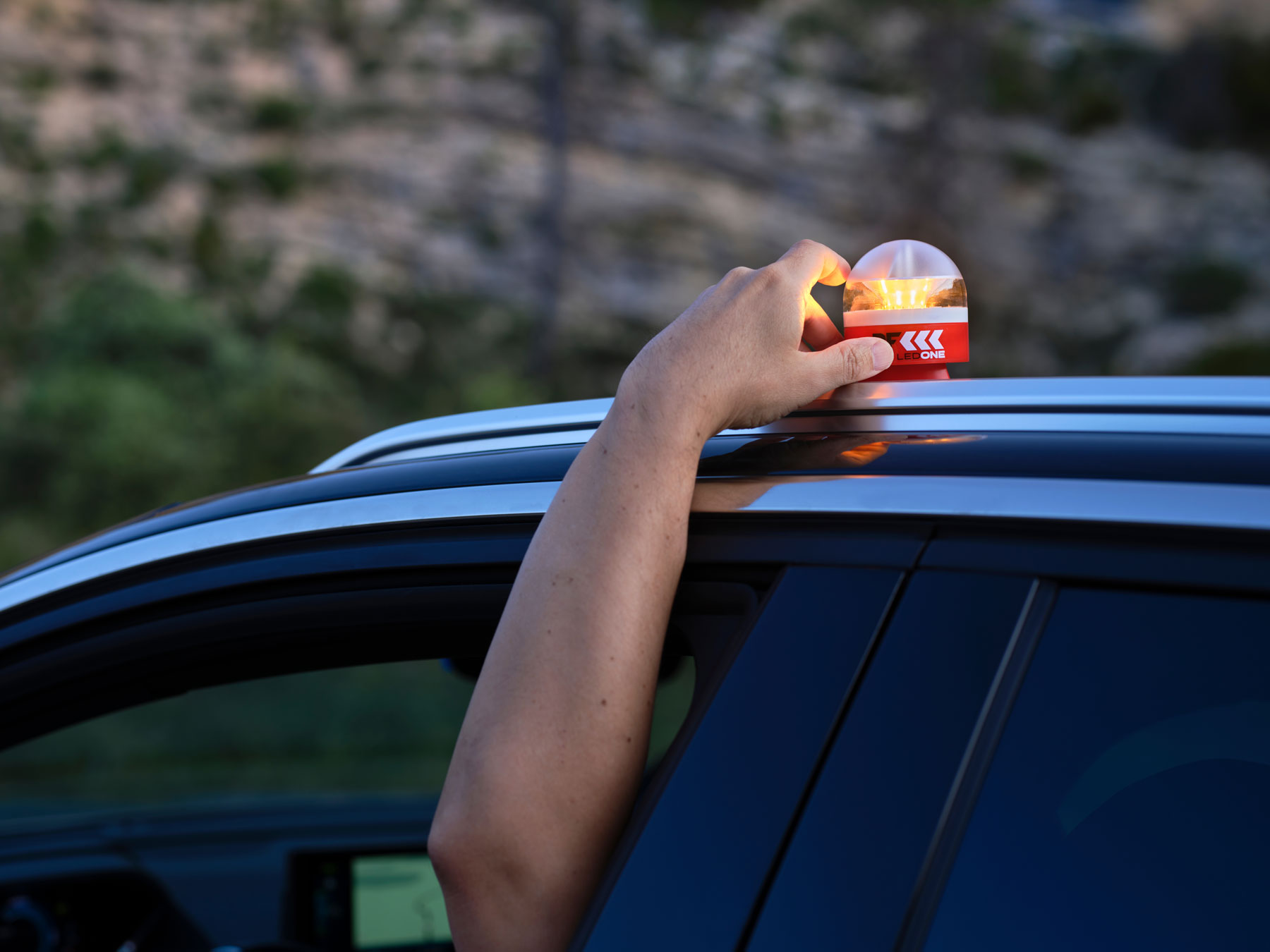 La baliza V16, colocada en el techo del vehículo, emite una luz intermitente visible hasta un kilómetro y avisa a otros conductores sobre el peligro. Además, el dispositivo está conectado a la plataforma DGT 3.0, lo que permite transmitir la ubicación del vehículo en tiempo real.