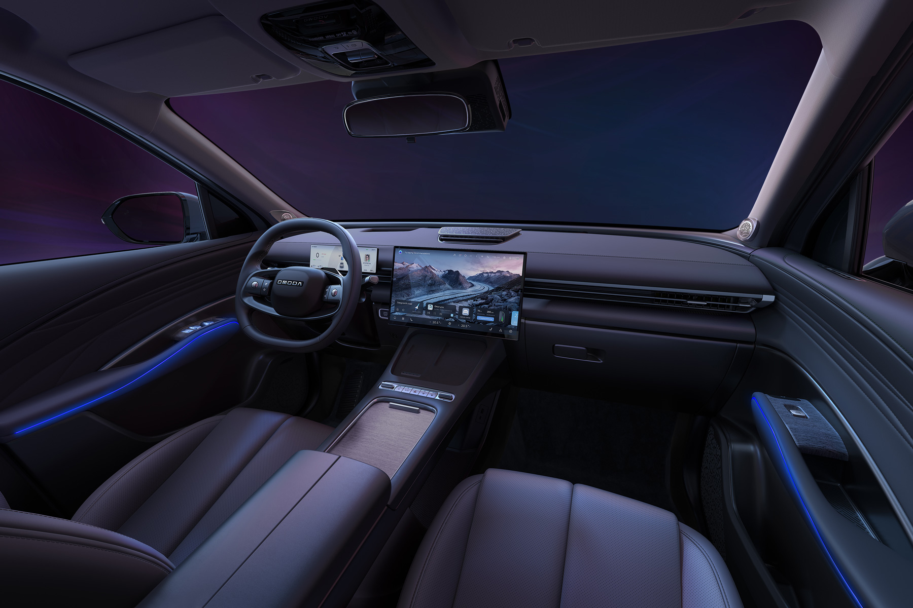 El habitáculo del OMODA 7 SHS está orientado a la comodidad y a la tecnología. Una de las características más destacadas es la pantalla central deslizante de 15,6 pulgadas con resolución 2,5 K, que integra la instrumentación y el sistema multimedia.