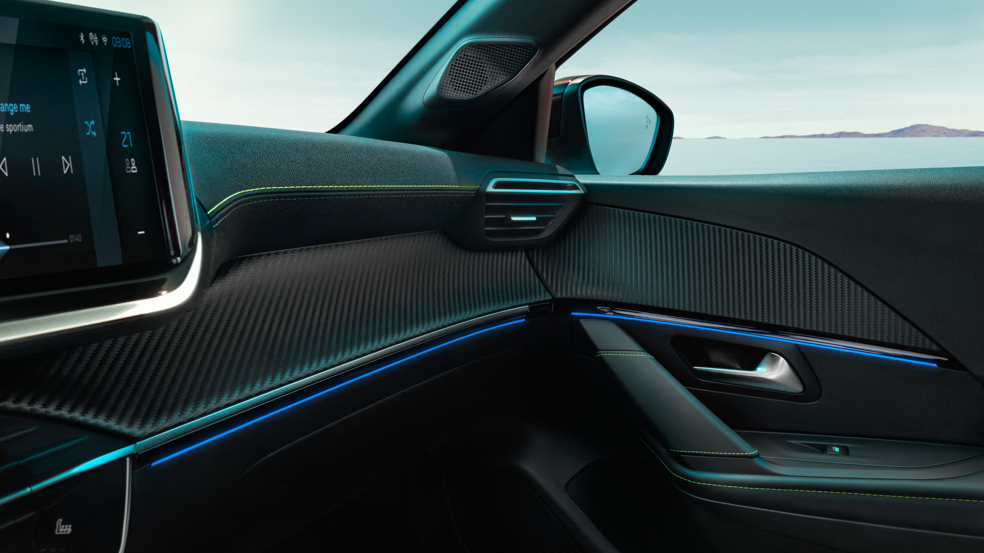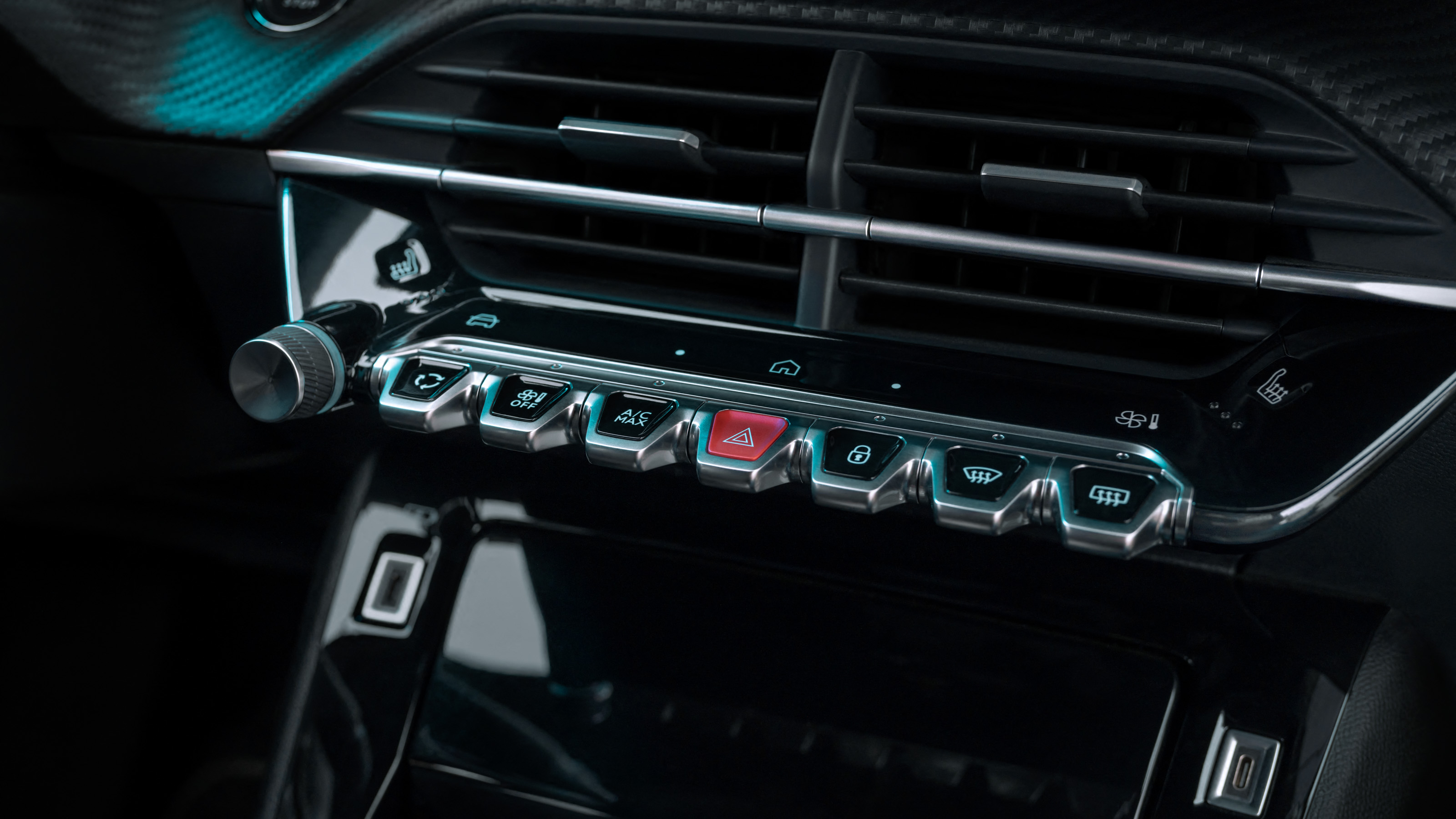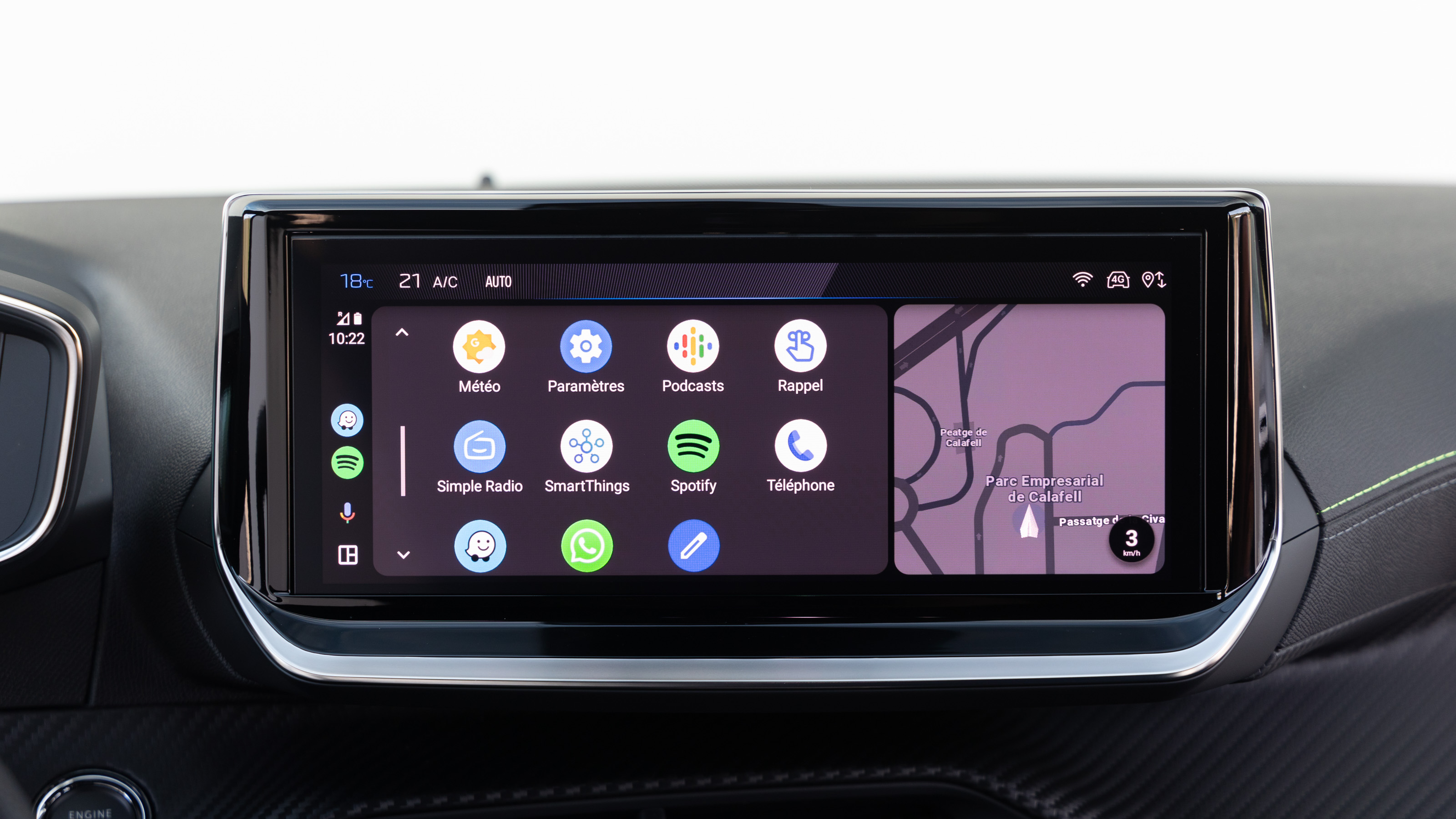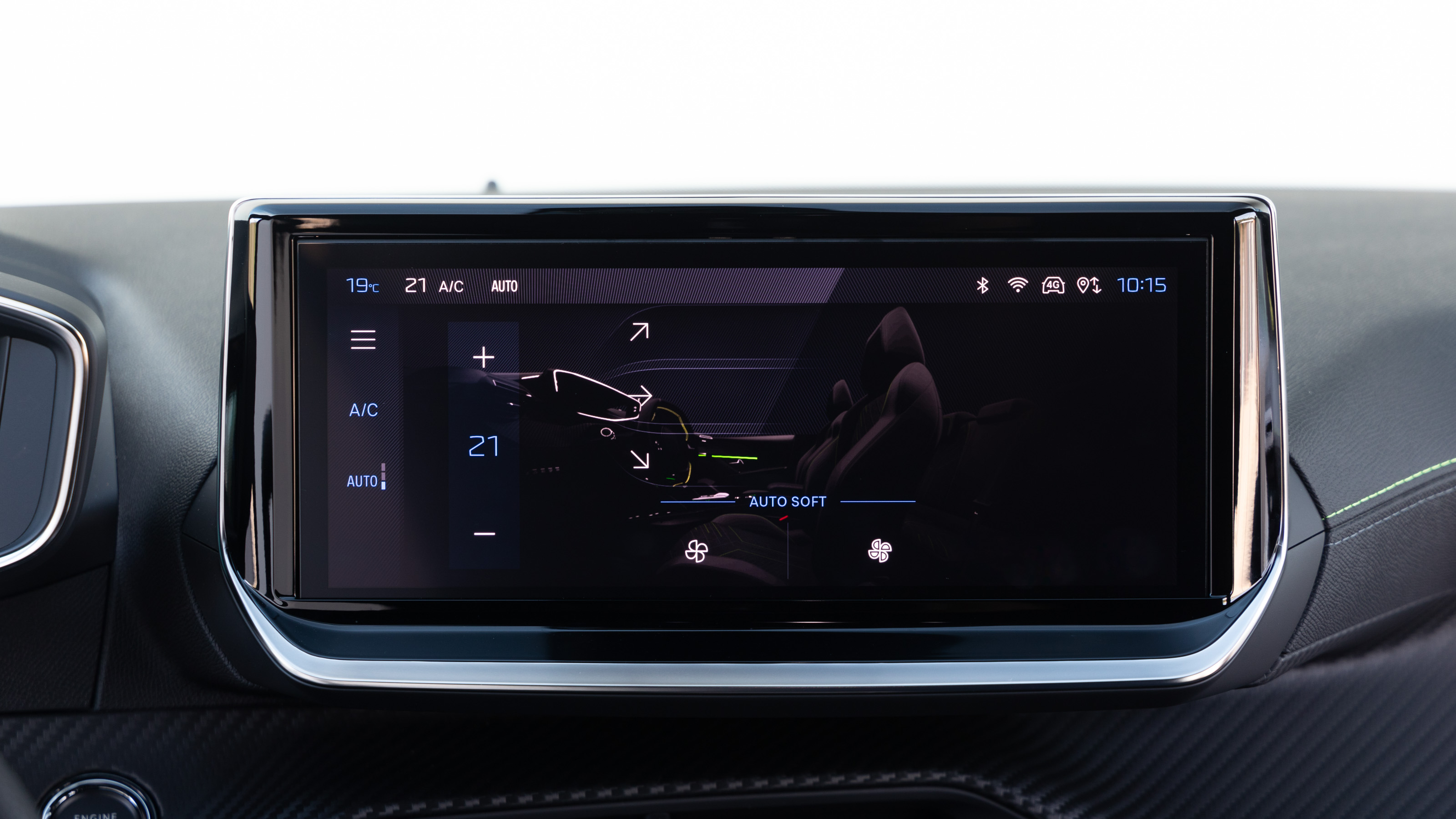 De serie el Peugeot E-208 ofrece una pantalla táctil de 10” en el centro del salpicadero. Desde ella se puede controlar el sistema multimedia, diversas funciones del vehículo y la climatización. La compatibilidad con Apple CarPlay y Android Auto inalámbrica es de serie, mientras que la navegación y los comandos por voz mejorados son opcionales. Varia su definición en los dos acabados más altos, de manera que la pantalla en estos es HD. En todas las versiones está presentes las teclas debajo de la pantalla central para acceder rápidamente a las funciones clave.