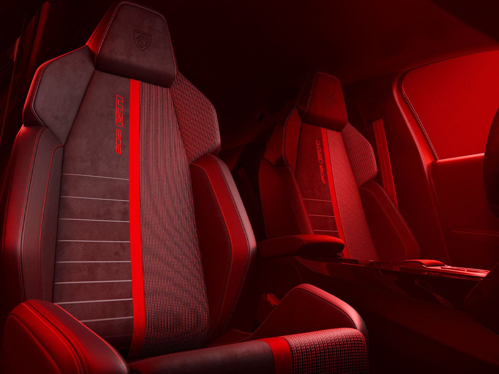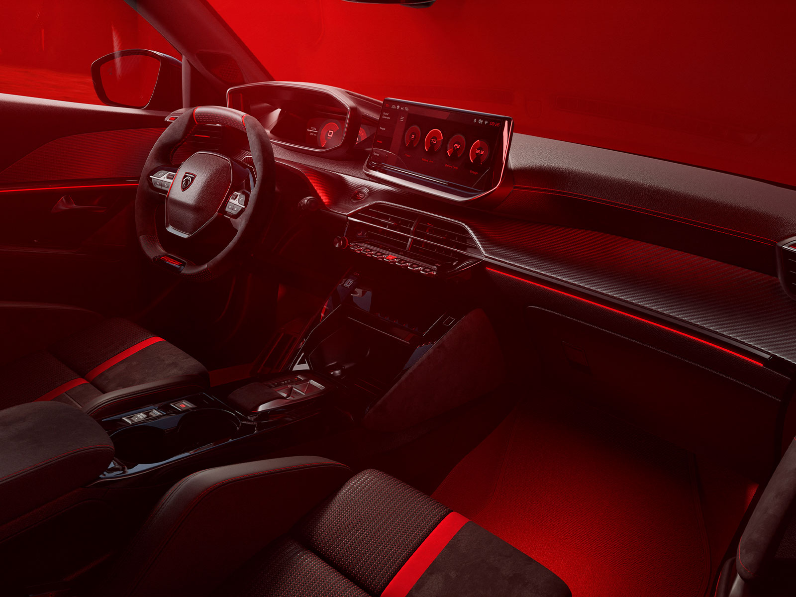 El E-208 GTi incluye el sistema i-Connect Advanced con navegación TomTom, compatibilidad total con Apple CarPlay y Android Auto inalámbrico, asistentes de conducción de última generación y unos acabados interiores de primer nivel: alcántara, tejidos premium y una ambientación sonora específica que simula el empuje del motor.