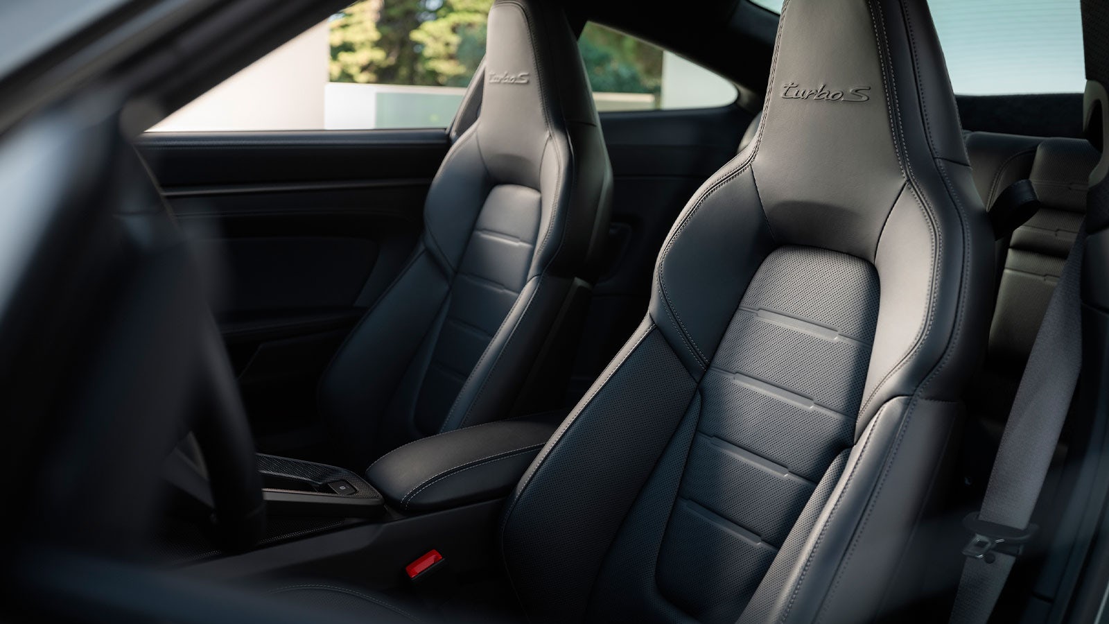 Dentro, el 911 Turbo S ofrece una atmósfera exclusiva con inserciones en fibra de carbono, tapicería premium y el logo Turbo S en reposacabezas y cinturones. De serie equipa asientos deportivos ajustables en 18 posiciones, el Sport Chrono Package, iluminación LED HD Matrix y un sistema de escape con sonido desarrollado específicamente para este modelo.