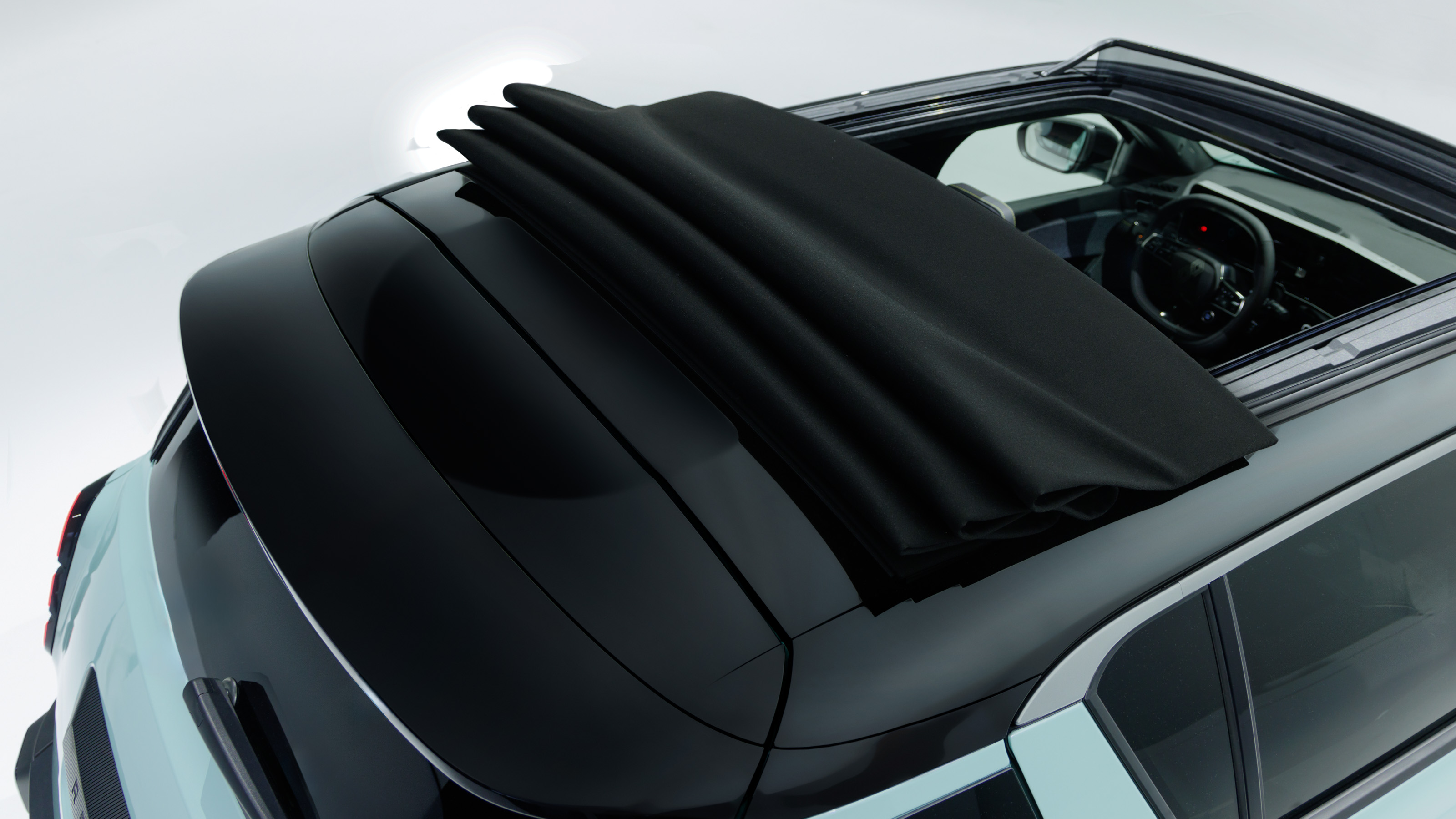 Entre las opciones más destacadas está el techo descapotable de lona, disponible en las versiones superiores. Otros elementos de equipamiento incluyen asientos traseros abatibles para mejorar la modularidad, sistema de climatización con bomba de calor para optimizar la eficiencia energética, y un sistema de sonido Harman Kardon disponible en los acabados más altos.