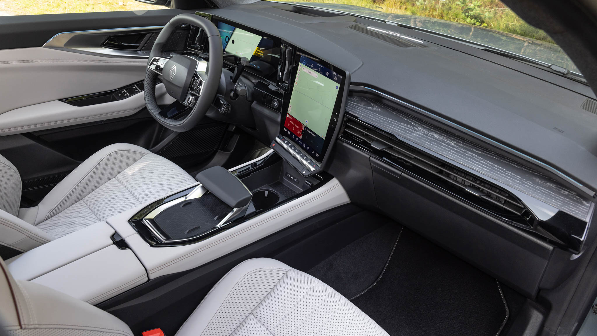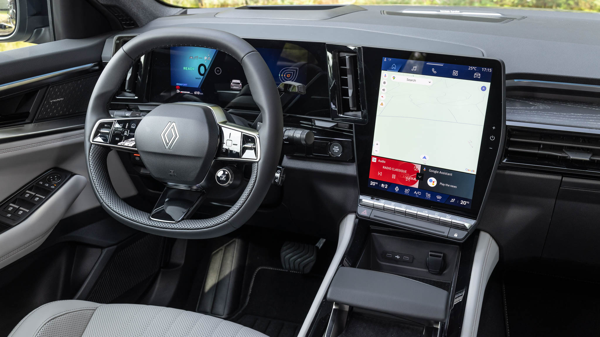 El habitáculo combina espacio, tecnología y confort. Los asientos delanteros, según el acabado, pueden ser calefactables, eléctricos y con función de masaje lumbar. En el caso del Esprit Alpine, destacan los tapizados en tejido con aspecto de fibra de carbono, detalles en Alcántara, pedales de aluminio y umbrales con el logotipo Alpine.