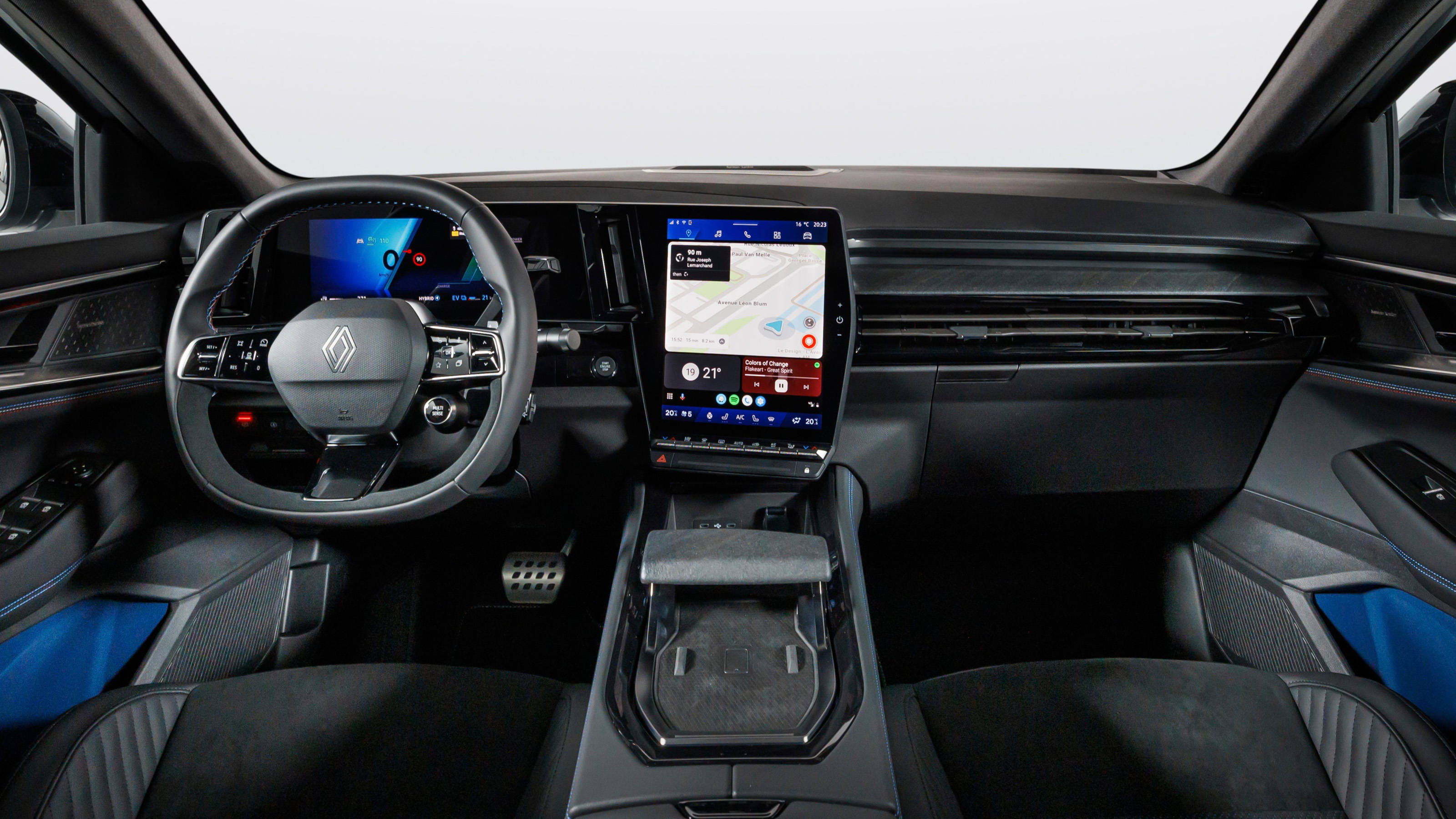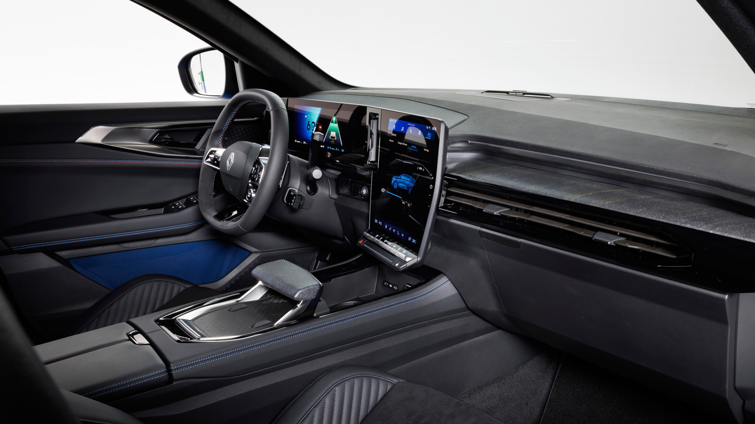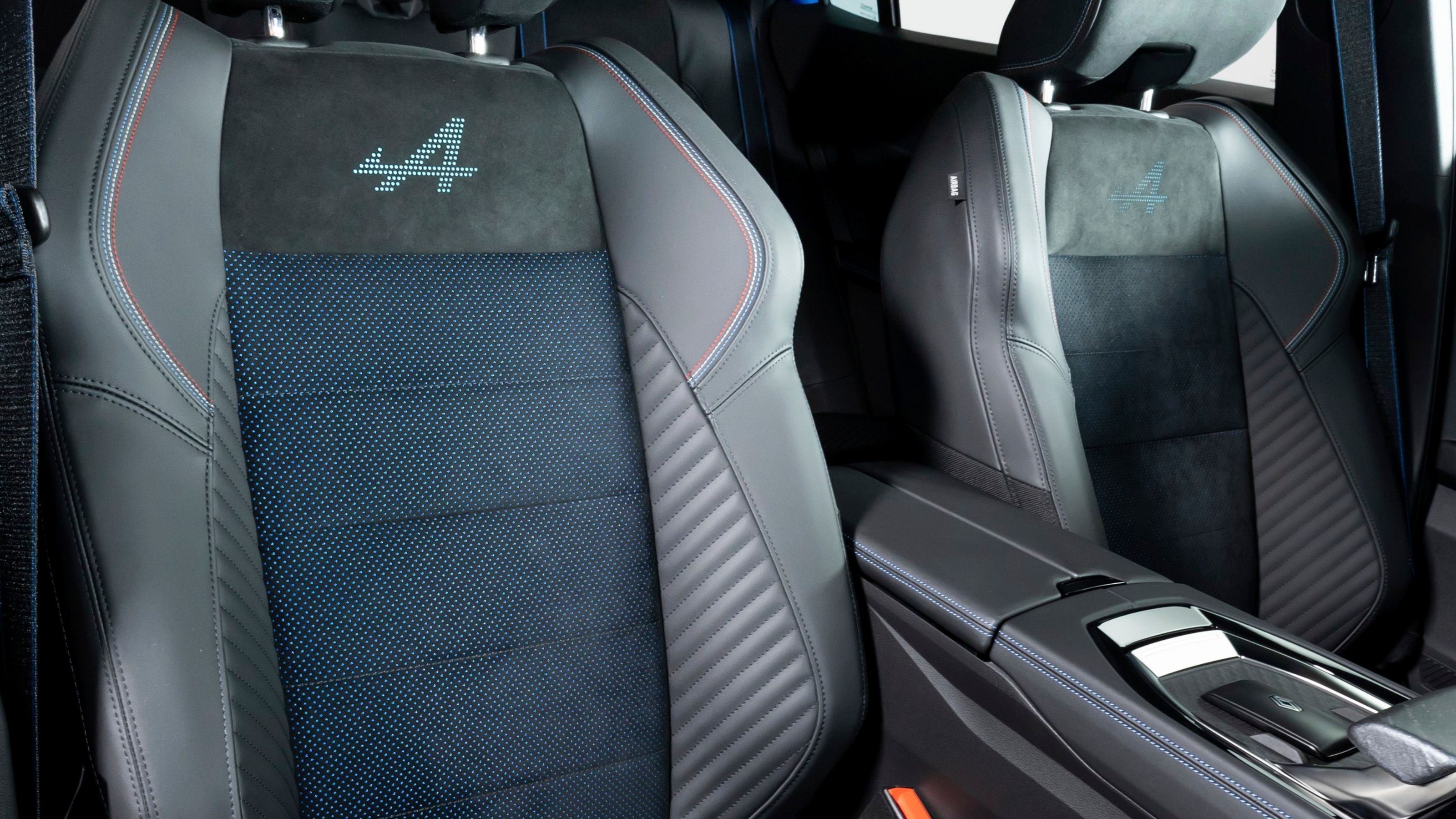 El acabado del habitáculo es parecido a lo que hemos visto recientemente en modelos como el Espace y el Austral. En el salpicadero hay dos grandes pantallas y la consola, prominente, se prolonga entre los asientos con varios huecos para dejar objetos. Los asientos son más llamativos que los de los modelos mencionados porque son más gruesos y de aspecto más deportivo, y en el caso del acabado esprit Alpine, llevan integrado el logo de Alpine retroiluminado. La calidad del conjunto parece buena.