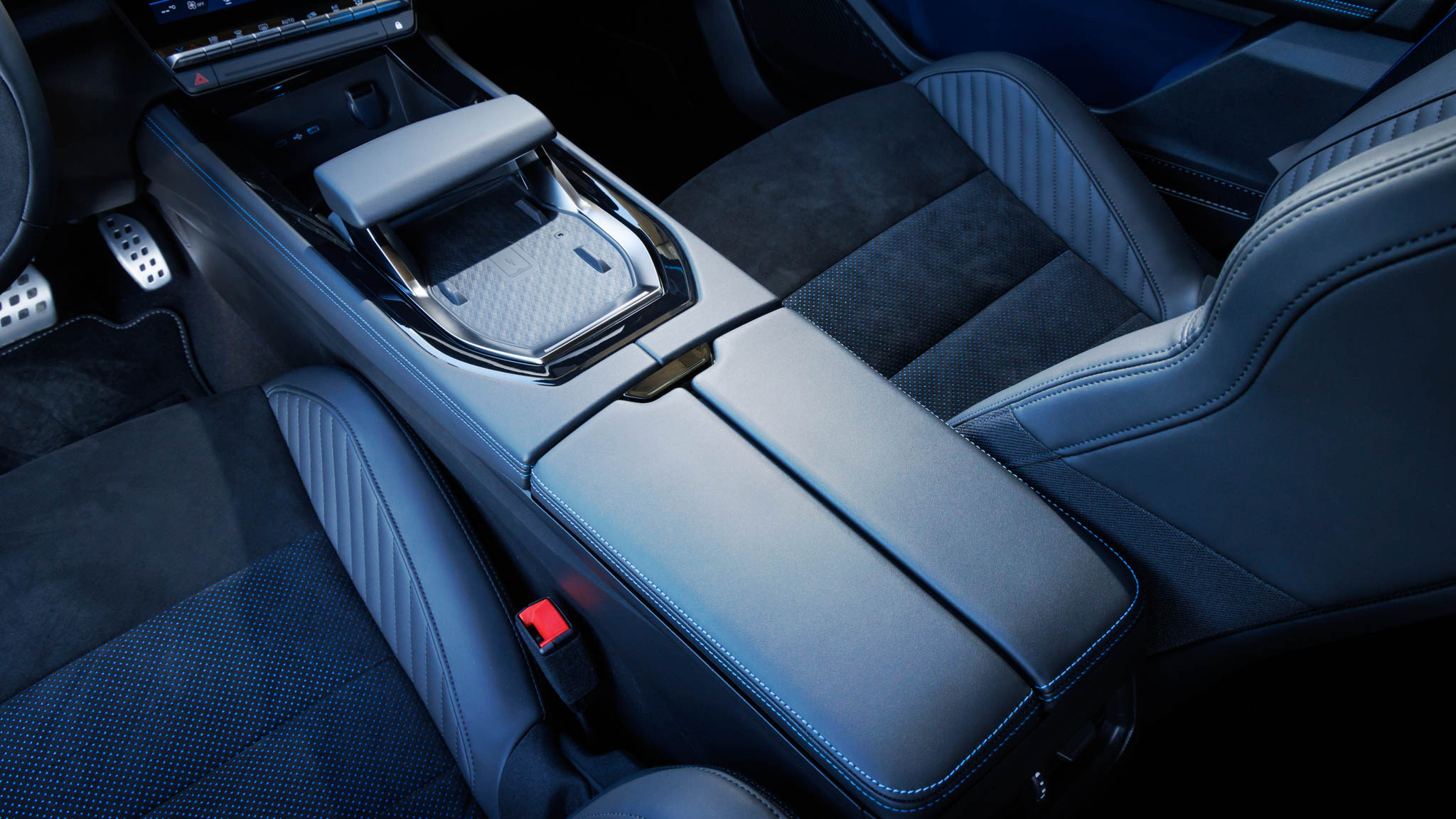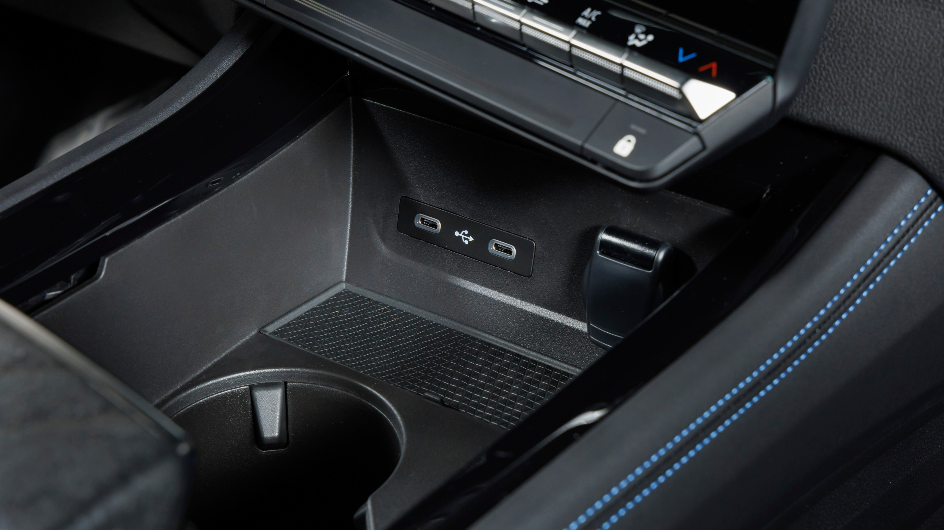 El habitáculo está bien rematado con muchos detalles que facilitan la vida a bordo. Por ejemplo, y manteniéndonos en las plazas posteriores, hay un reposabrazos amplio y muy elaborado que aloja unas tomas para la recarga de dispositivos y unos pequeños soportes que permiten colocar un móvil o una tablet. En la prolongación de la consola, entre los asientos, hay salidas de aire del sistema de climatización y otro par de tomas USB.