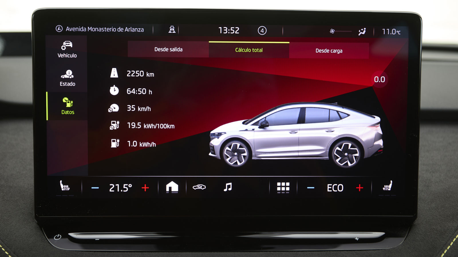 Como tiene muy buena aerodinámica, consume poco si las condiciones son favorables, pero es muy sensible al uso y es fácil que se eleve por encima de lo deseable. El día que lo probé no era ideal porque hacía mucho frío e iba a lo que iba, que era ver qué tal se desenvolvía por una carretera de curvas. En cualquier otra circunstancia de uso normal, gastar en torno a 22 kWh/100 km con el Enyaq Coupé iV RS es asumible y sencillo. Y esta cifra es normal y un poco elevada para el tipo de coche que es, ya que actualmente algunos de sus competidores mejoran esa cifra.