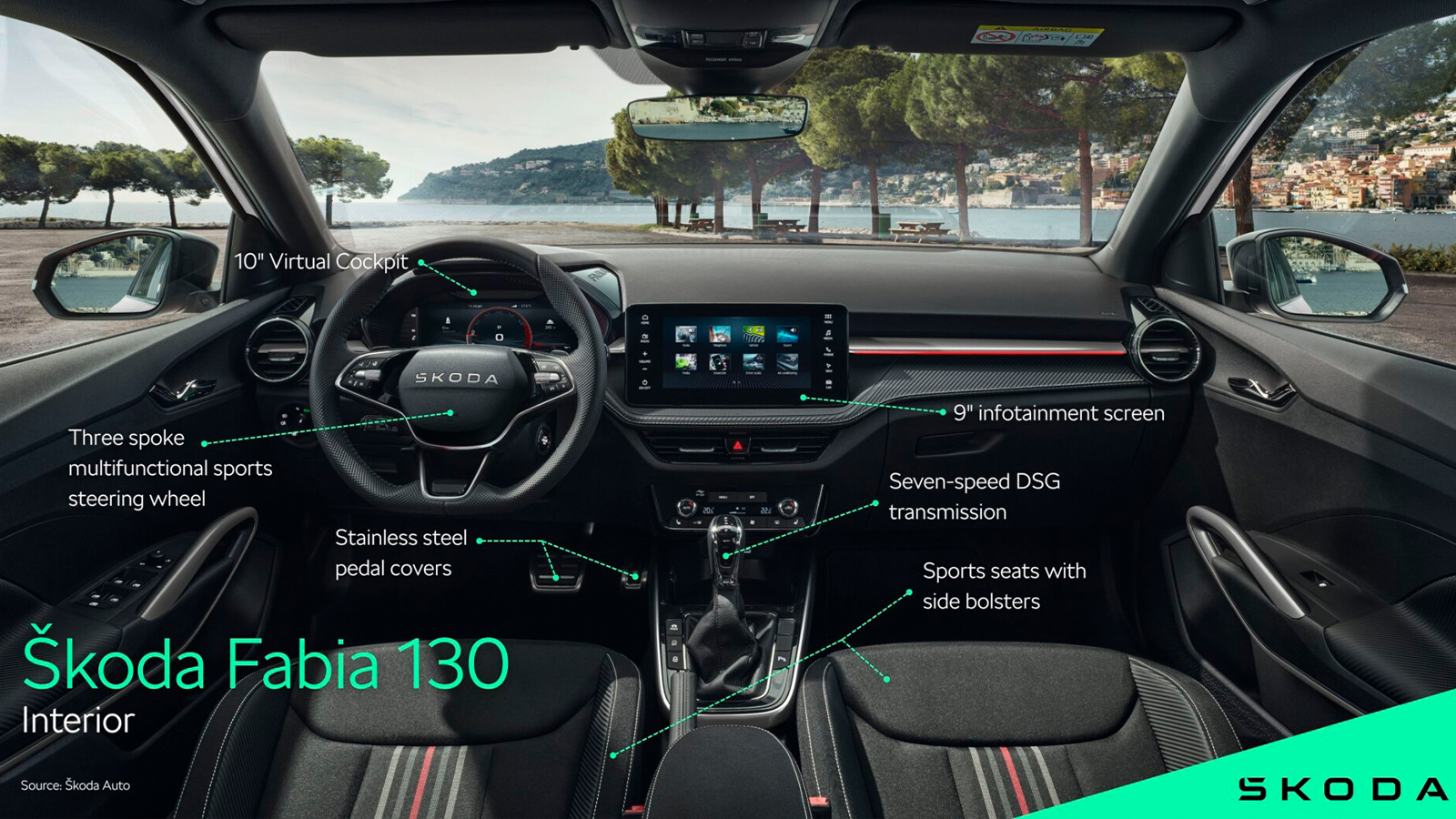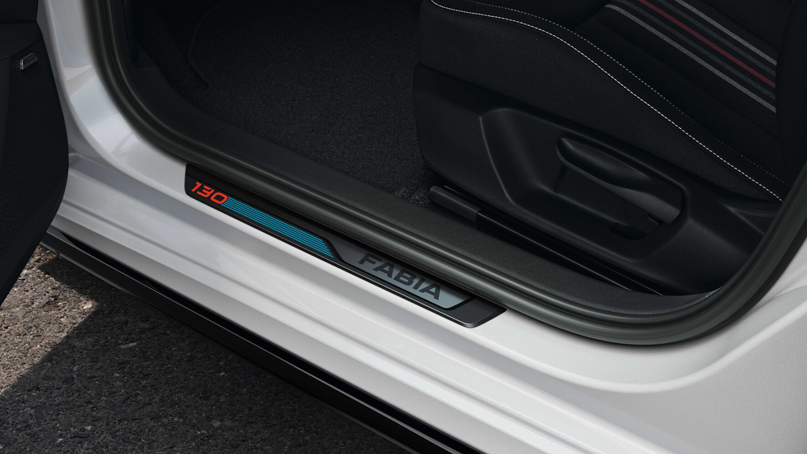 El habitáculo mantiene el planteamiento práctico del Fabia, pero introduce detalles específicos para esta edición. Incorpora asientos deportivos eléctricos con mayor sujeción lateral, volante multifunción de tres radios con levas DSG, pedales metálicos y molduras de umbral exclusivas con el emblema 130.
