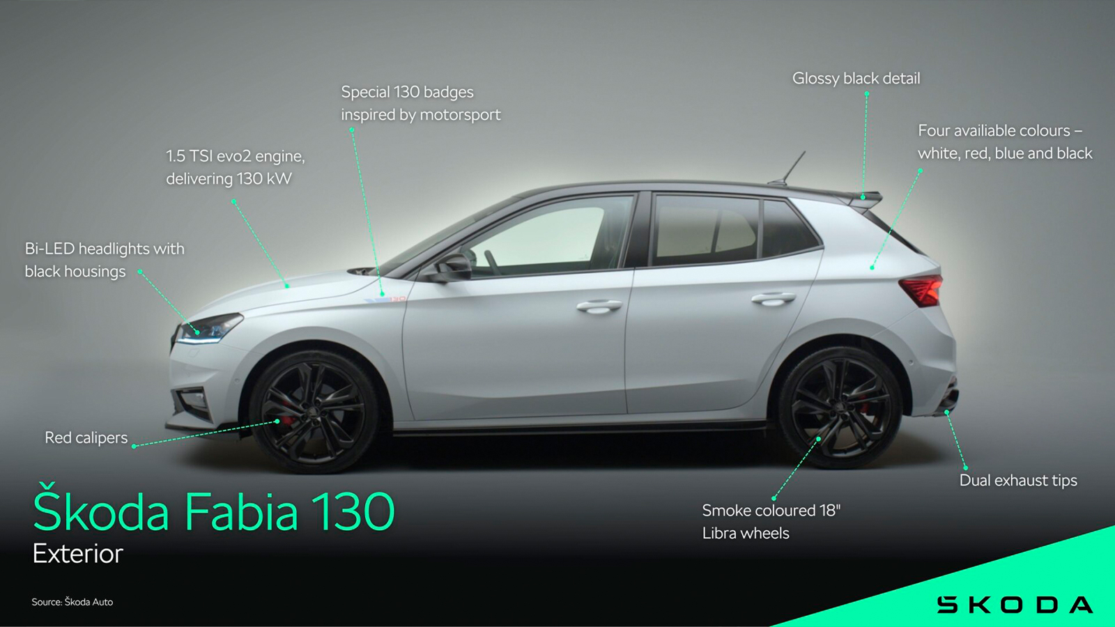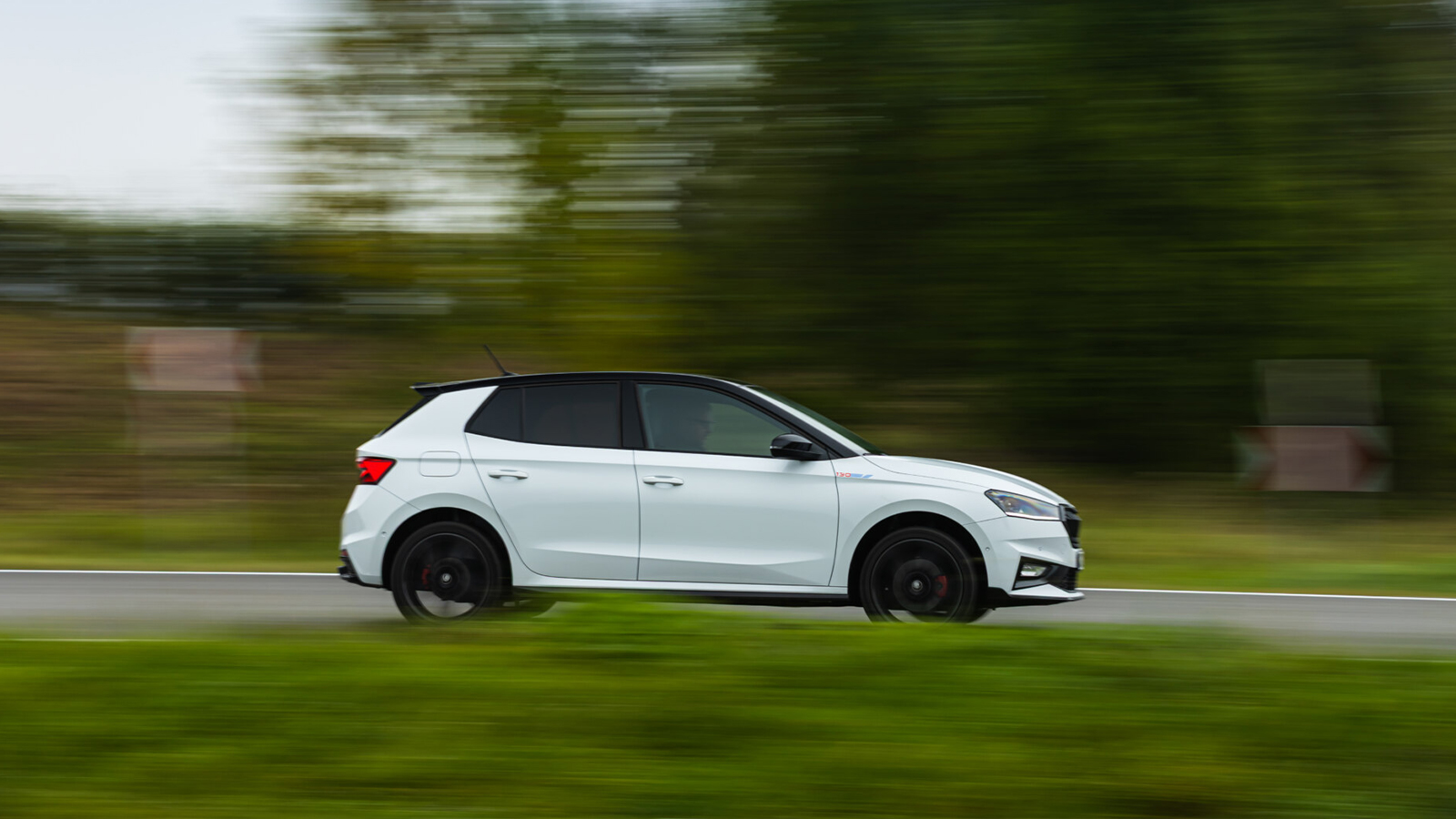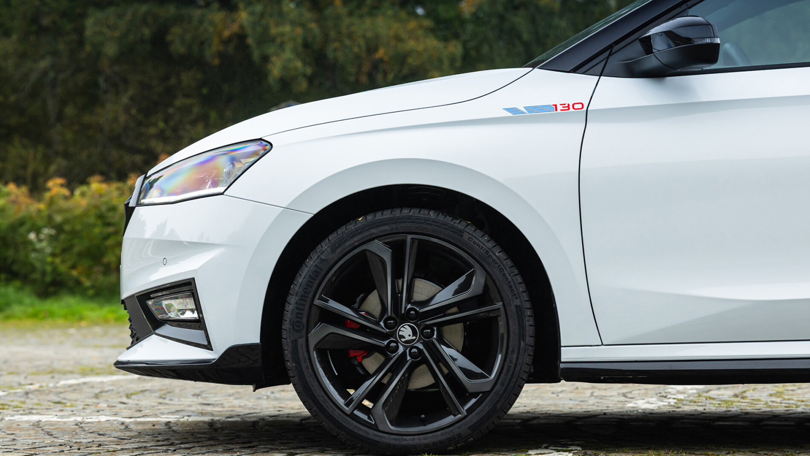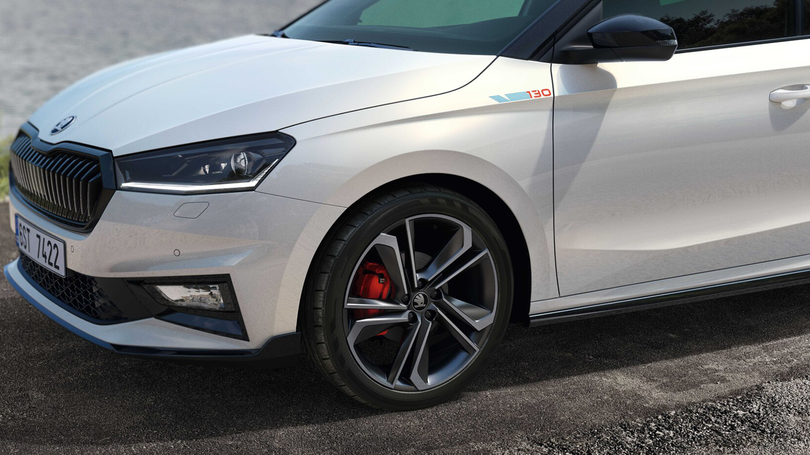 Visualmente, el Fabia 130 mantiene la base Monte Carlo, pero añade detalles específicos que lo diferencian con claridad. Uno de los primeros detalles es que equipa llantas exclusivas Libra de 18 pulgadas con acabado Smoke, pinzas de freno en rojo, doble salida de escape visible y múltiples elementos en negro brillante: alerones delantero y trasero, difusor, franja horizontal posterior y detalles en el frontal.