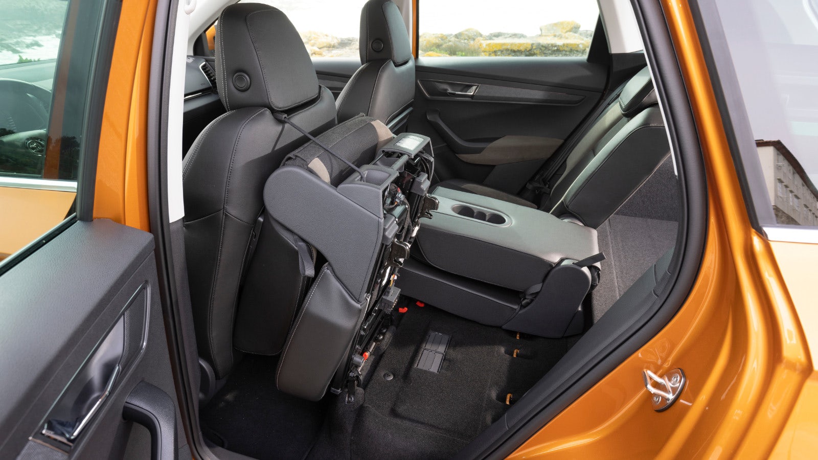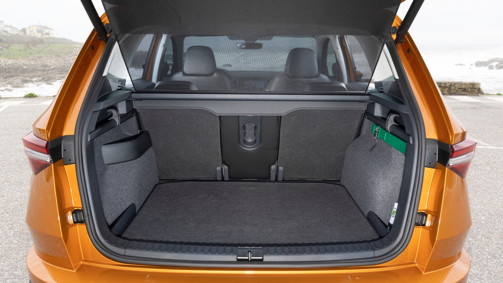 El Karoq tiene un maletero con 521 litros de capacidad mínima. En combinación con el sistema VarioFlex, este volumen se puede ampliar hasta los 588 litros. Con los respaldos de la segunda fila de asientos abatidos, se logran 1.630 litros (1.605 con VarioFlex). Si se desmontan y se eliminan por completo las plazas traseras, algo que permite VarioFlex, se consigue un total de 1.810 litros. Se debe tener en cuenta que la tracción 4x4 reduce la altura de este compartimento en 11 cm. Como referencia, un Volkswagen Tiguan, que es un SUV más grande que este, ofrece casi la misma de capacidad básica (520 litros). Existen huecos portaobjetos a ambos lados y la boca de acceso, aunque es ancha, queda a una altura un poco excesiva. Además, el portón puede tener accionamiento eléctrico en opción o venir de serie en las versiones superiores.