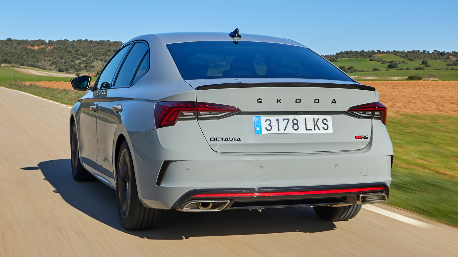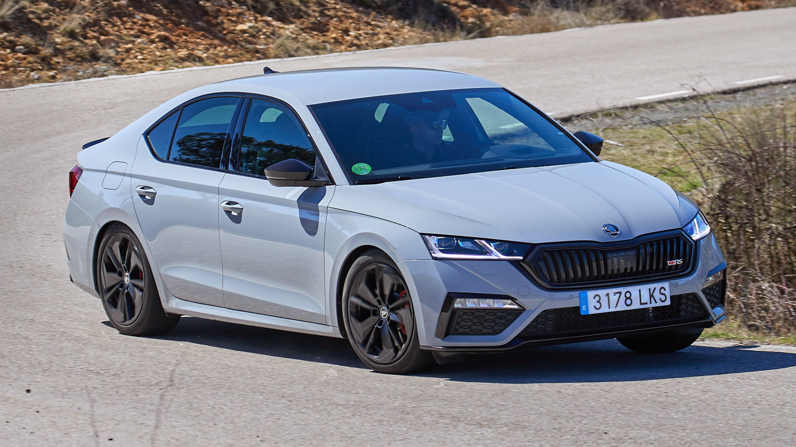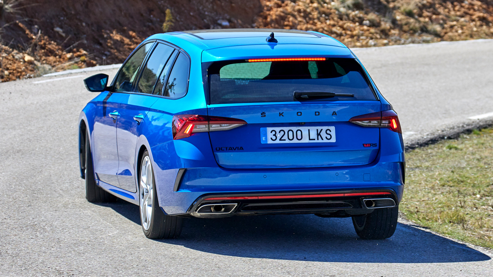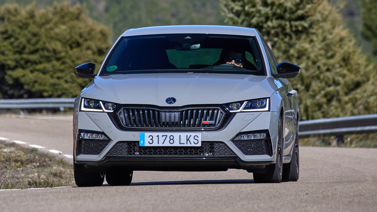 En España, Škoda ofrece de serie, sin coste extra, la suspensión de dureza regulable DCC. Esta suspensión permite elegir tres niveles de firmeza de los amortiguadores: Comfort, Normal y Sport. Entre las dos posiciones extremas se nota la diferencia. En la posición Comfort la carrocería va un poco suelta para circular rápido, hasta el punto de que puedes notar que, si vas muy rápido, el coche no hace los apoyos más fuertes con la precisión deseable y se alarga la trazada por el exterior del punto que habías tomado como referencia. La posición Sport es buena para ir rápido por zonas de curvas, porque no hace que se endurezca la capacidad de filtrado hasta el punto de producir rebotes que descoloquen el coche en pleno apoyo si las ruedas pisan un bache. No esperes un coche tan inmediato ni visceral como un Honda Civic Type R, pero sí mucho más gratificante de llevar rápido que un Octavia convencional, cuya suspensión de serie es blanda y orientada al confort.