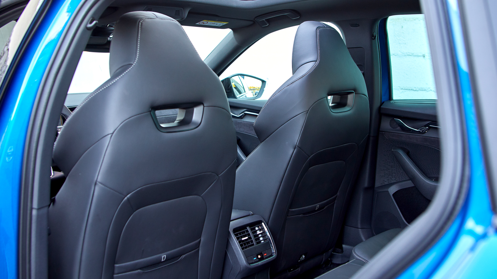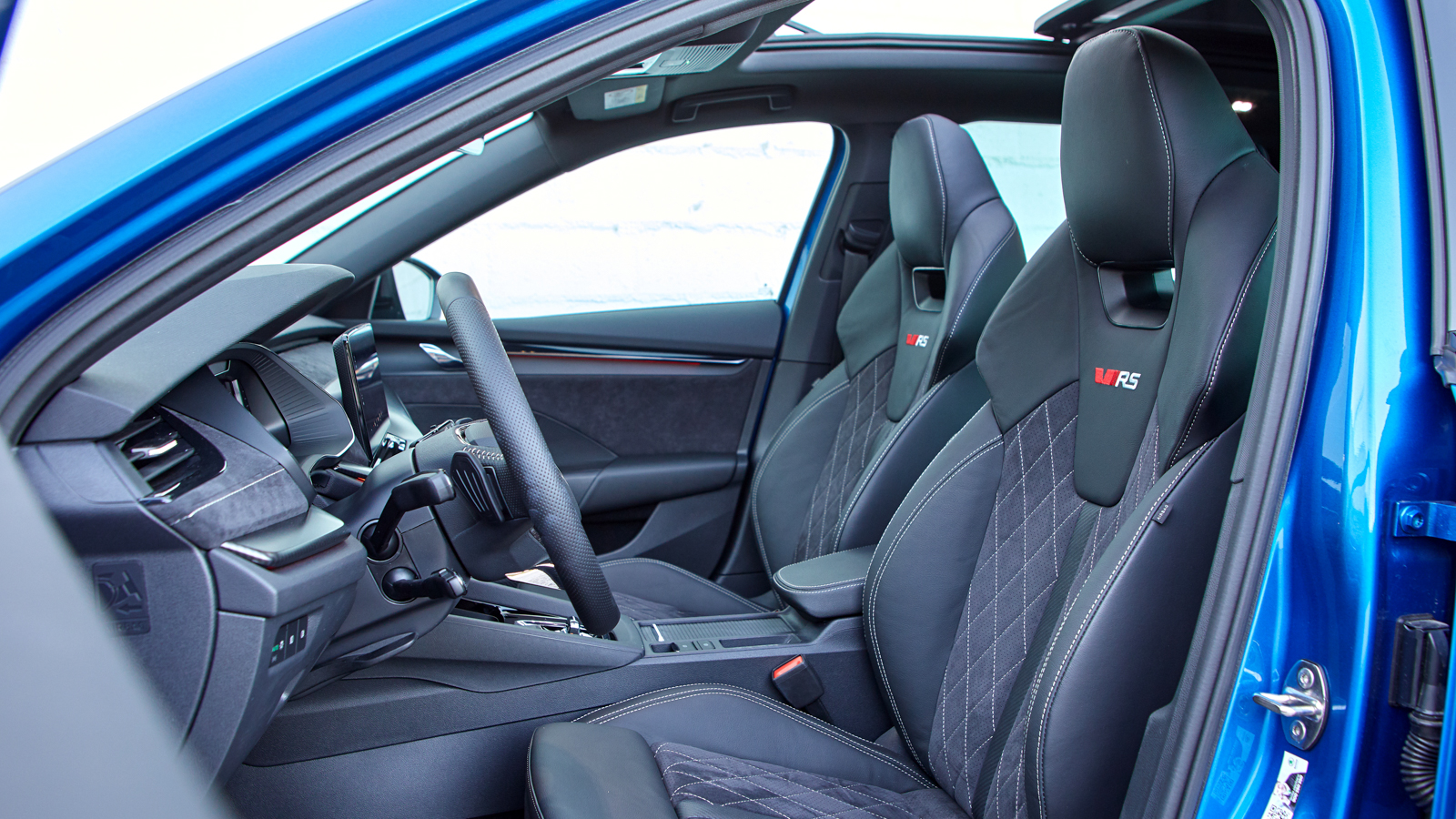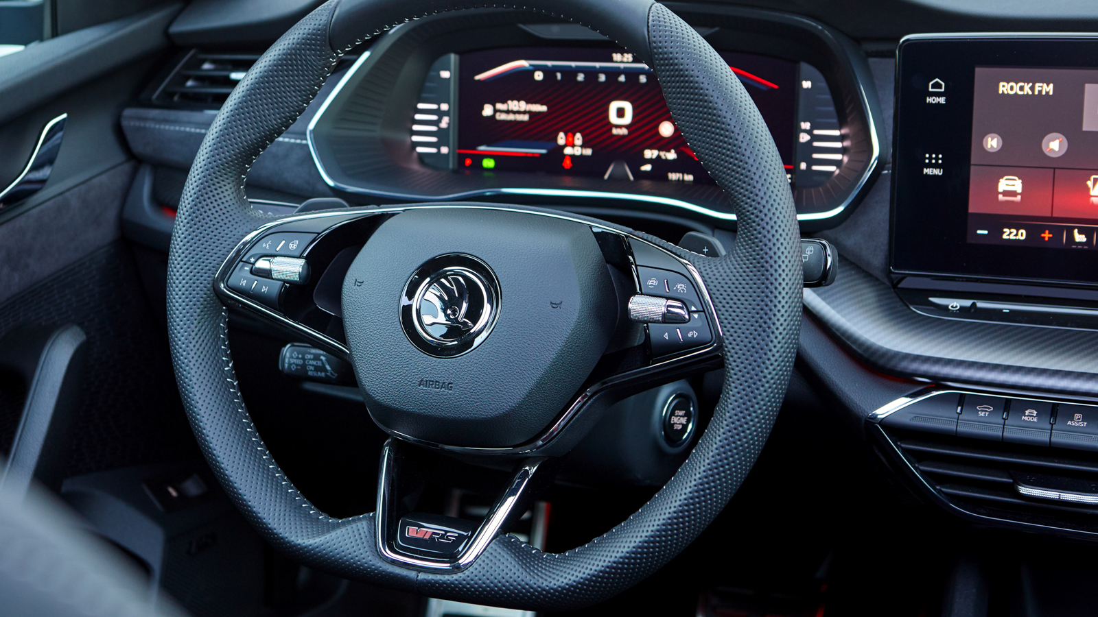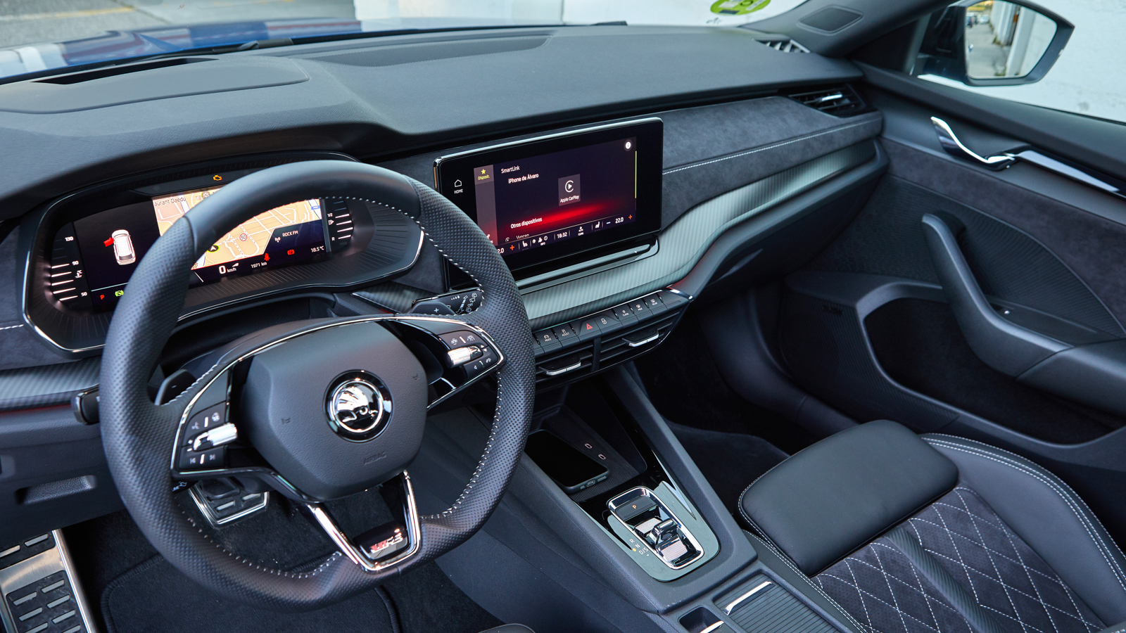 En España, Škoda ofrece de serie, sin coste extra, la suspensión de dureza regulable DCC. Esta suspensión permite elegir tres niveles de firmeza de los amortiguadores: Comfort, Normal y Sport. Entre las dos posiciones extremas se nota la diferencia. En la posición Comfort la carrocería va un poco suelta para circular rápido, hasta el punto de que puedes notar que, si vas muy rápido, el coche no hace los apoyos más fuertes con la precisión deseable y se alarga la trazada por el exterior del punto que habías tomado como referencia. La posición Sport es buena para ir rápido por zonas de curvas, porque no hace que se endurezca la capacidad de filtrado hasta el punto de producir rebotes que descoloquen el coche en pleno apoyo si las ruedas pisan un bache. No esperes un coche tan inmediato ni visceral como un Honda Civic Type R, pero sí mucho más gratificante de llevar rápido que un Octavia convencional, cuya suspensión de serie es blanda y orientada al confort.
