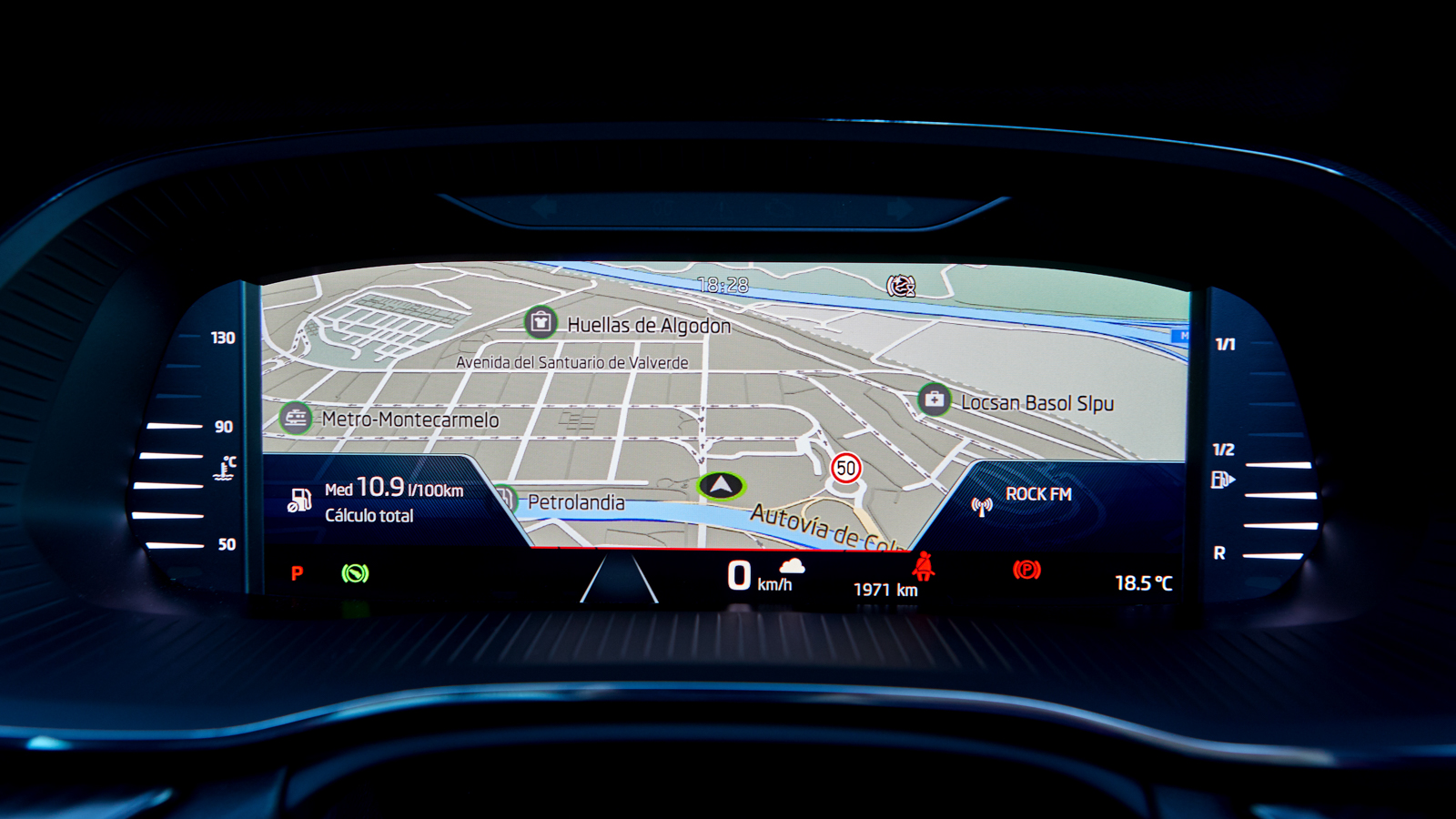 En el equipamiento de los Octavia RS va incluida la pantalla de instrumentación Virtual Cockpit, de 10,25 pulgadas, con un diseño gráfico específico que enfatiza el carácter deportivo del coche a costa de perder algo de legibilidad al primer vistazo. Es un sistema de funcionamiento correcto, aunque el manejo de los menús a través de los mandos del volante no es todo lo intuitivo que suele ser cualquier entorno virtual en otros Skoda más sencillos.