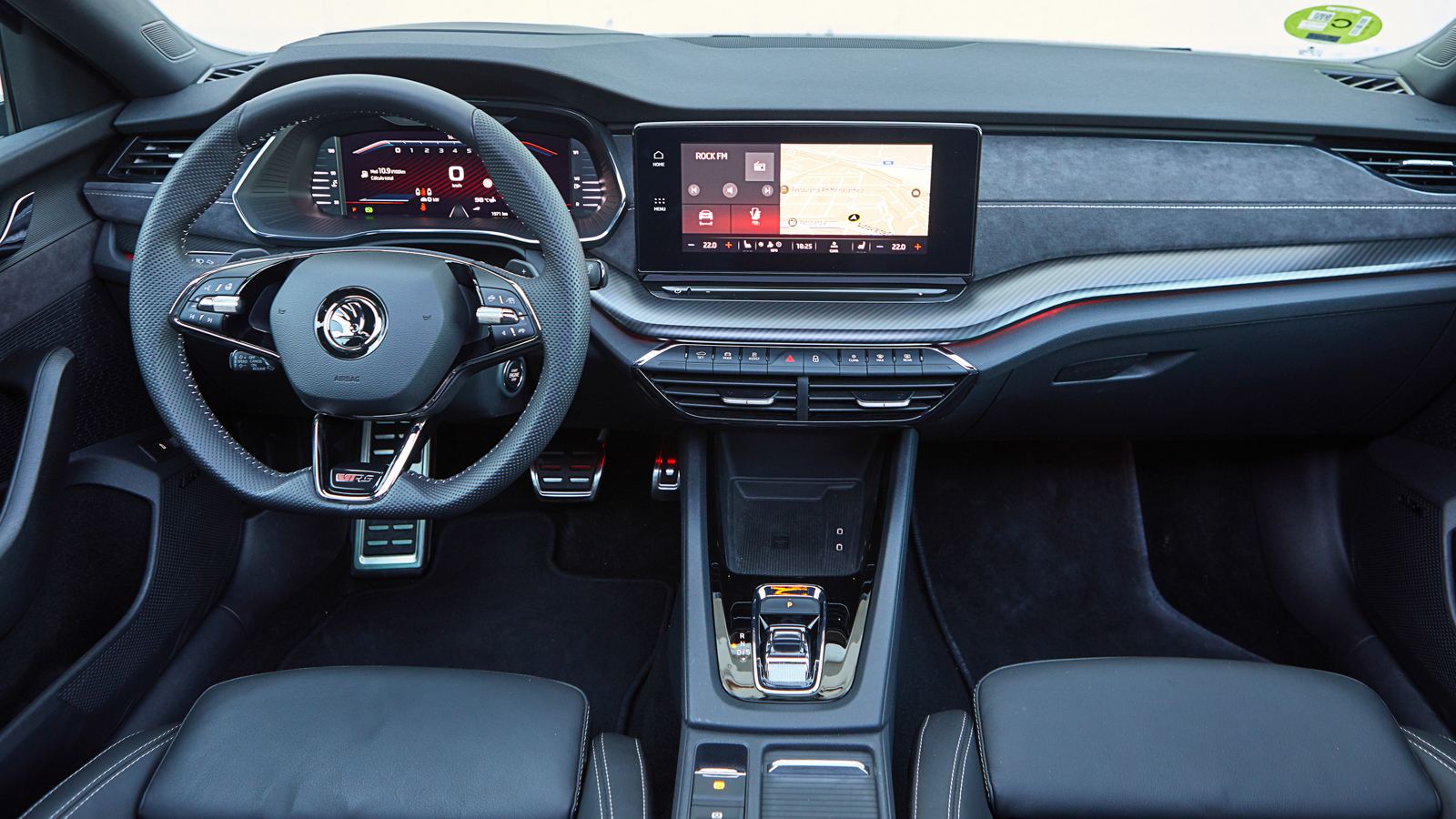 Las molduras decorativas del salpicadero tienen apariencia de fibra de carbono y la parte superior de la consola y los paneles de las puertas están tapizados en Alcántara. El volante, los pedales metálicos y el techo de color negro son otros detalles que distinguen a los Octavia RS del resto de versiones.