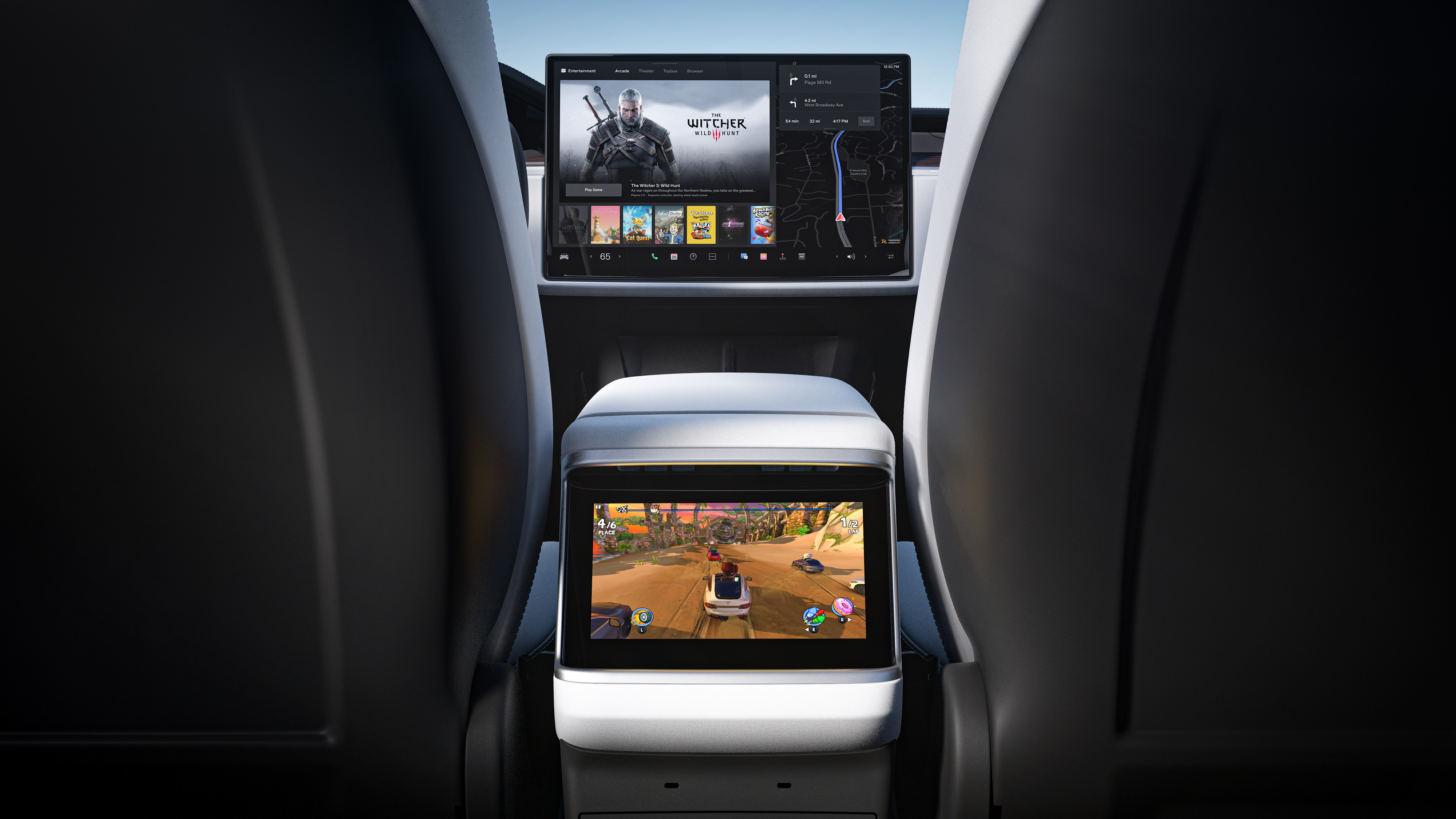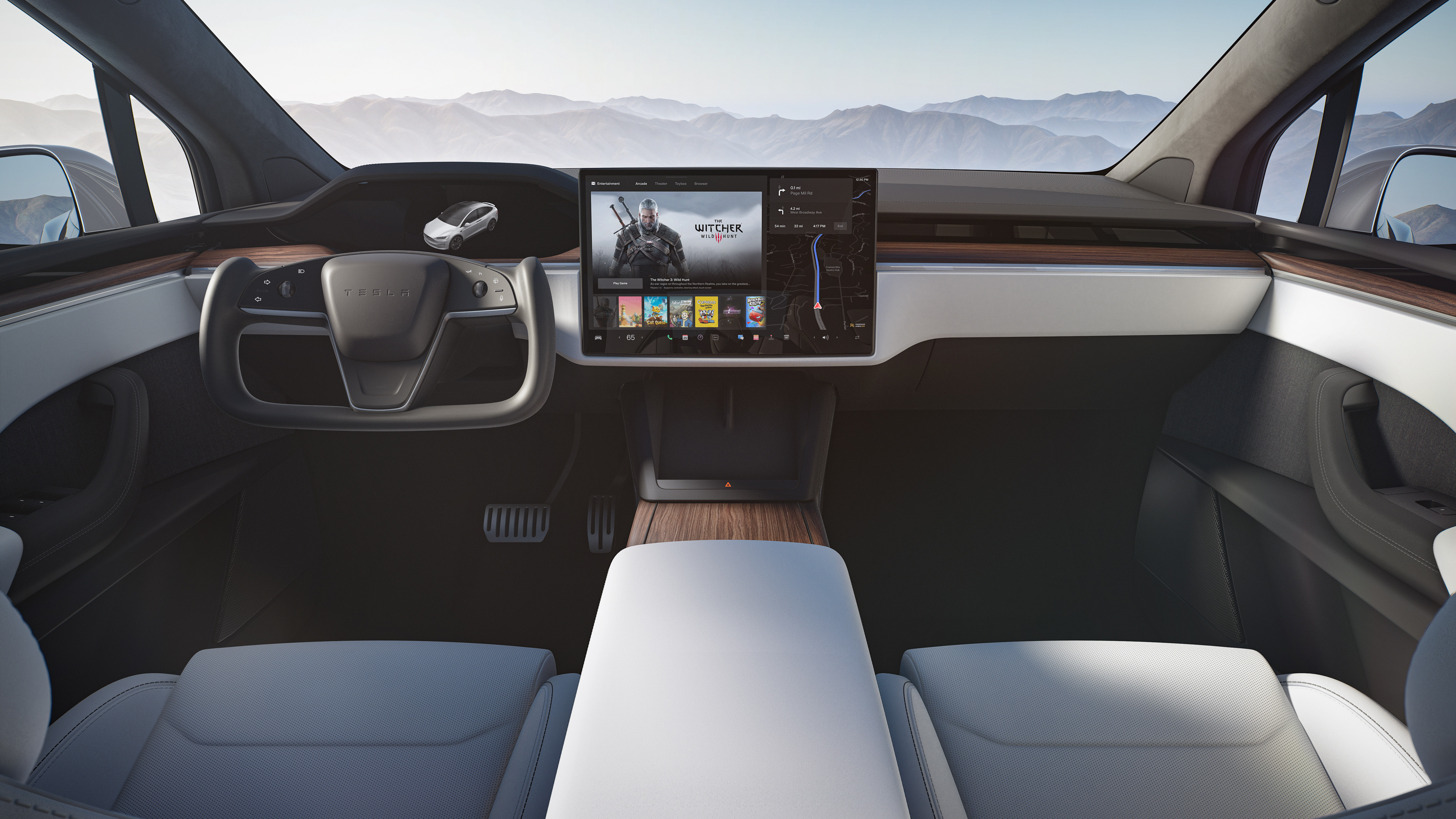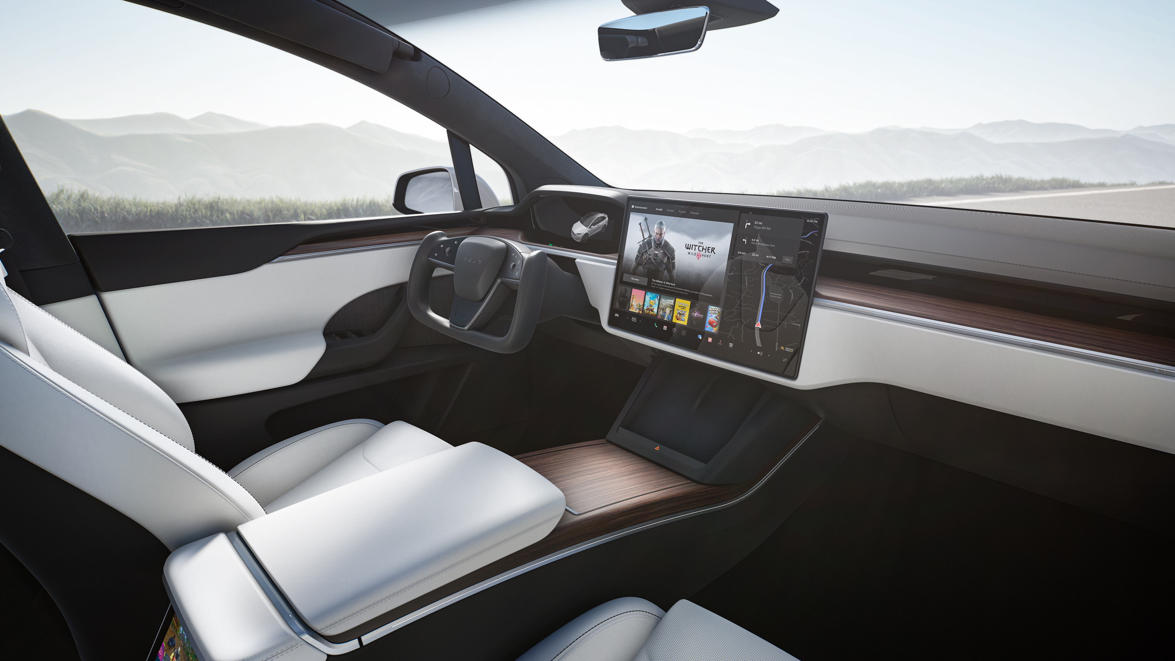 El Tesla Model X tiene un salpicadero con una pantalla horizontal de 17 pulgadas y orientación regulable. También hay una pantalla para la instrumentación, más pequeña, detrás del volante, y una tercera para los pasajeros de la segunda fila de asientos, colocada al final de la consola central y entre las butacas delanteras. Desde esta se puede controlar el sistema de climatización o jugar a videojuegos con un mando inalámbrico.