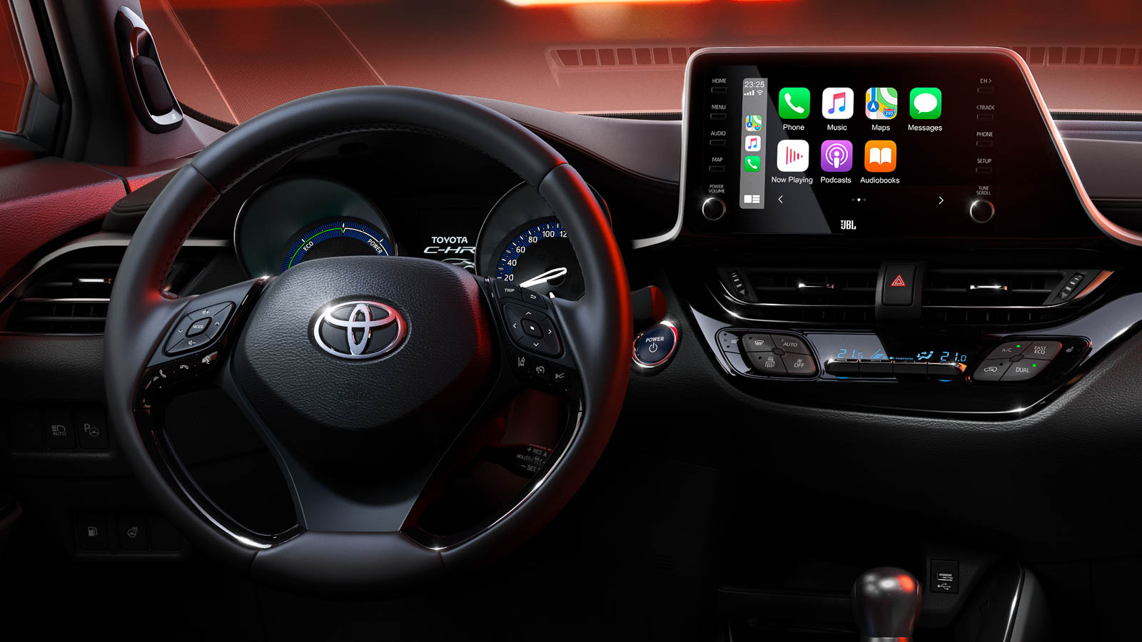 El Toyota C-HR cuenta con un interior actualizado en el que se dan la mano lo tradicional y las últimas tecnologías. El cuadro de instrumentos combina los diales analógicos con una pantalla digital para el ordenador de viaje. En la consola central encontramos la pantalla táctil del sistema multimedia de 8 pulgadas que con la última actualización ofrece Apple Car Play y Android Auto.