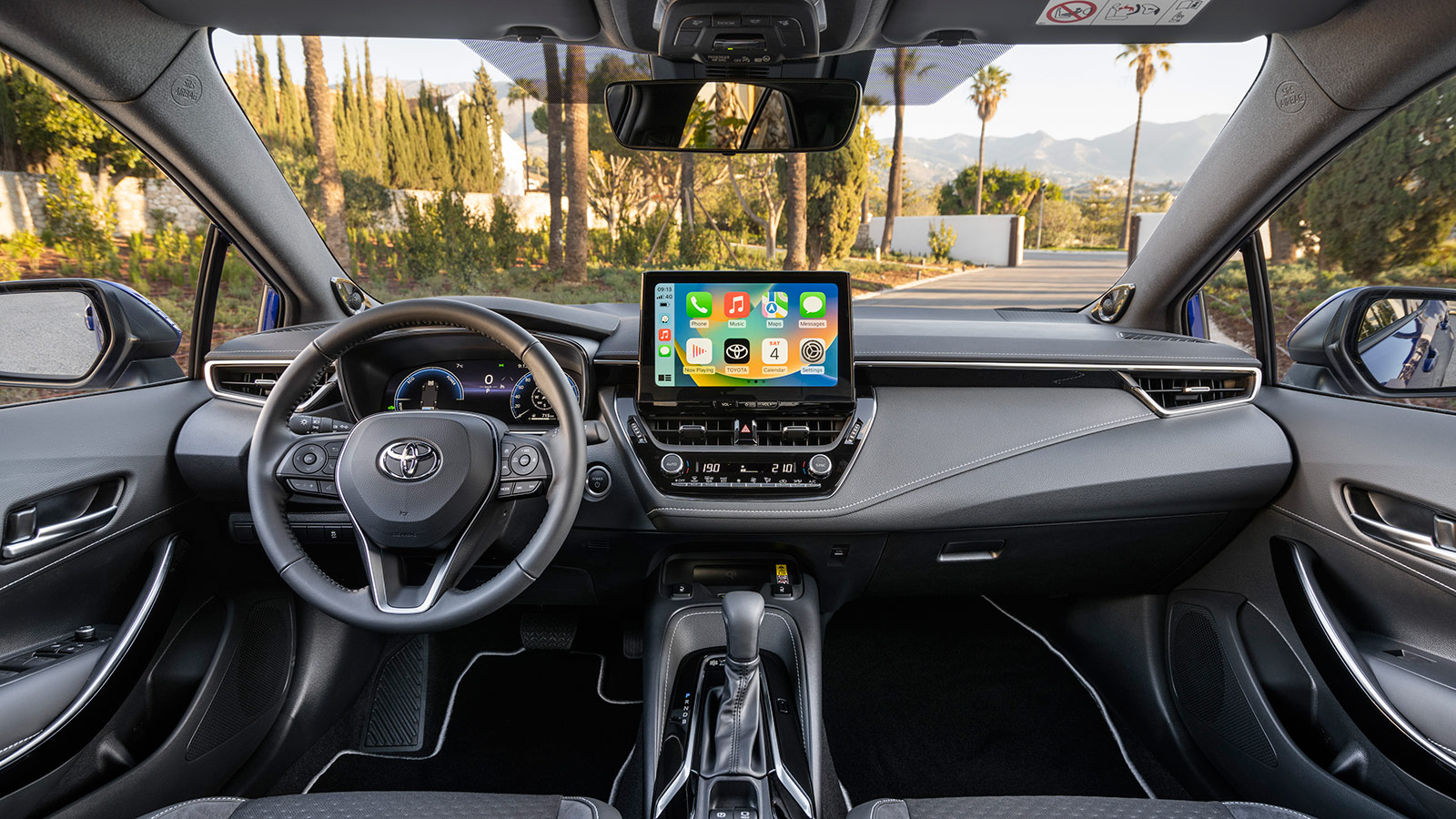 La actualización de equipamiento de 2023 ha sido todo un acierto. El apartado multimedia era claramente un punto en el Toyota Corolla se había quedado totalmente desfasado. Ahora monta el mismo sistema de infoentretenimiento estrenado en el bZ4X, con una pantalla central de 10,5 pulgadas que supone un salto evidente respecto a la antigua de ocho pulgadas: es más rápida, tiene mejor resolución y los menús son mucho más intuitivos. Aun así, la mayoría seguirá tirando de Apple CarPlay y Android Auto, que vienen de serie y funcionan de forma impecable.