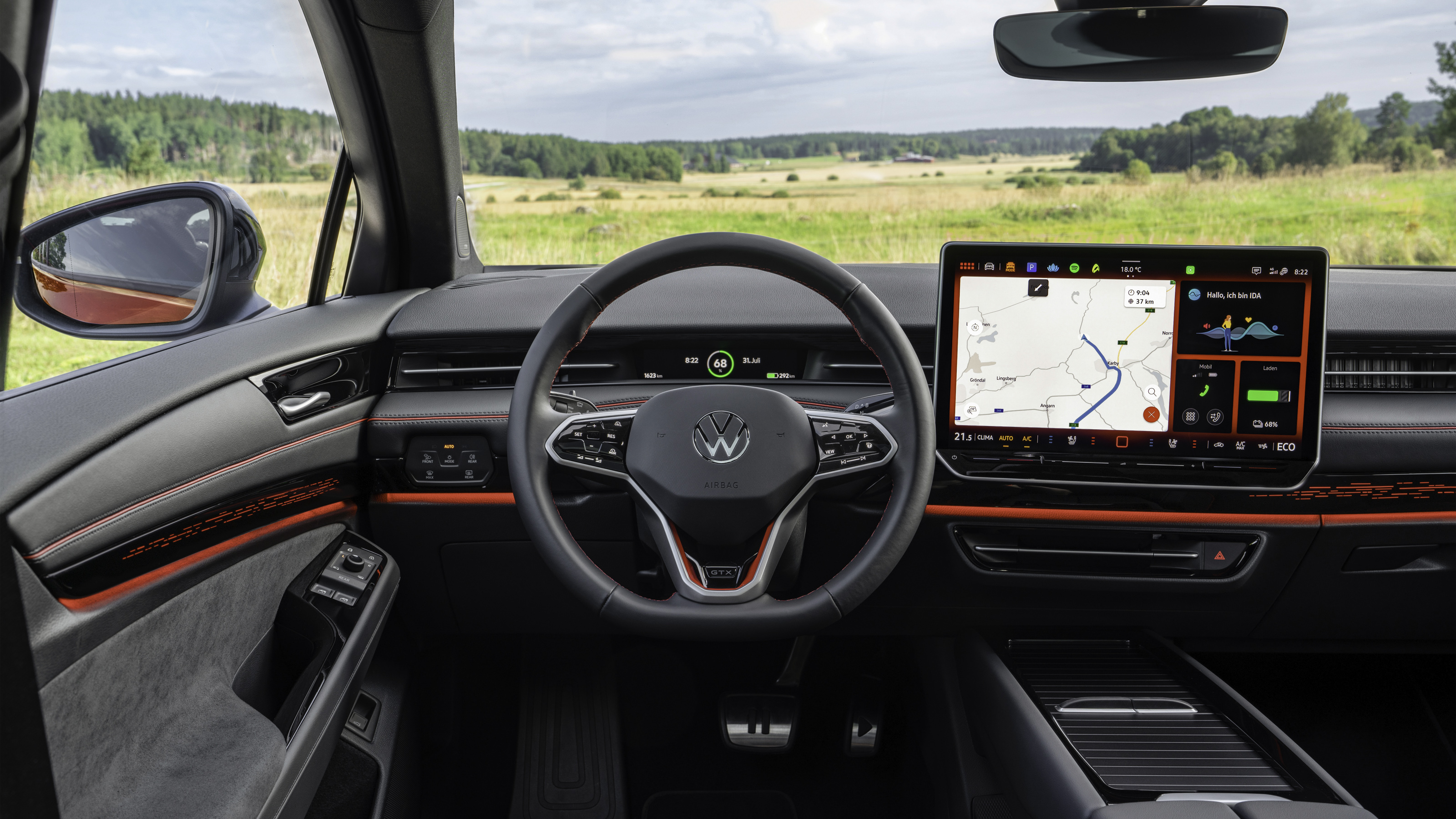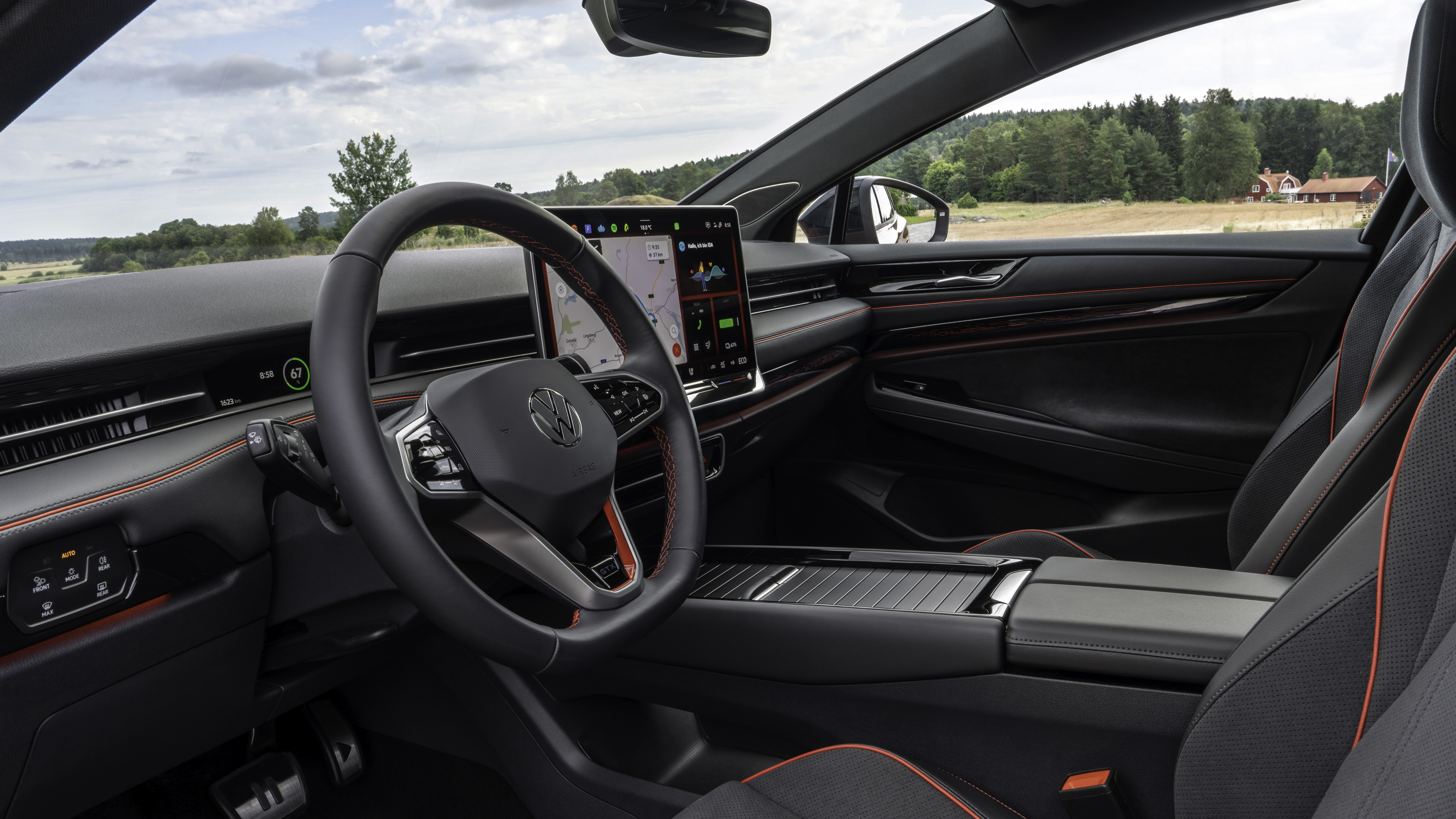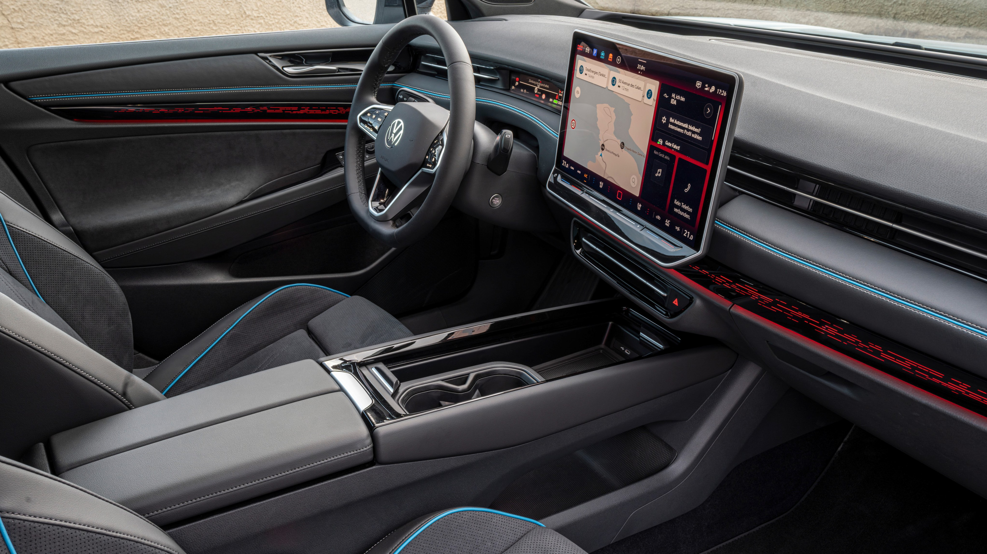 El diseño interior del ID.7 GTX cuenta de serie con el sistema Head-up-Display con realidad aumentada como fuente principal de información para el conductor. Los detalles en rojo se extienden al volante multifunción calefactable y a otros componentes del interior.