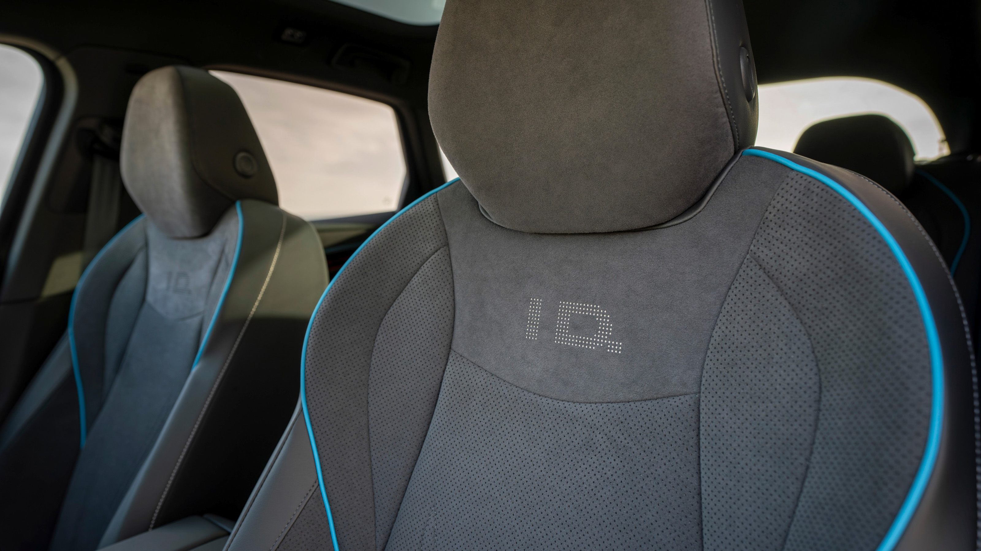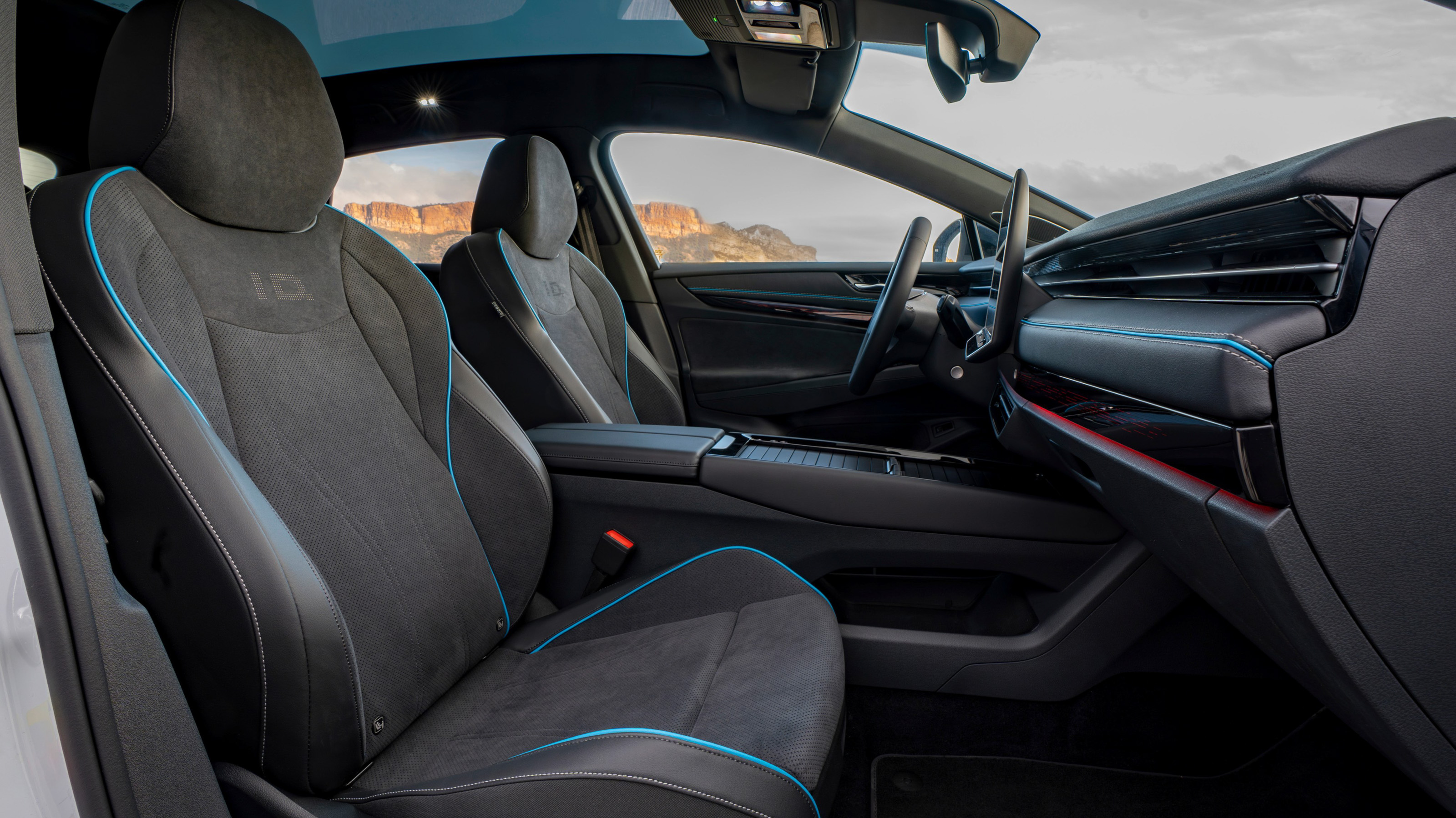 El ID.7 GTX cuenta con asientos específicos GTX, revestidos con microfibra "ArtVelours Eco" y cuero sintético. Se diferencian por detalles en rojo, como costuras decorativas, ribetes y la inscripción GTX perforada en los respaldos.