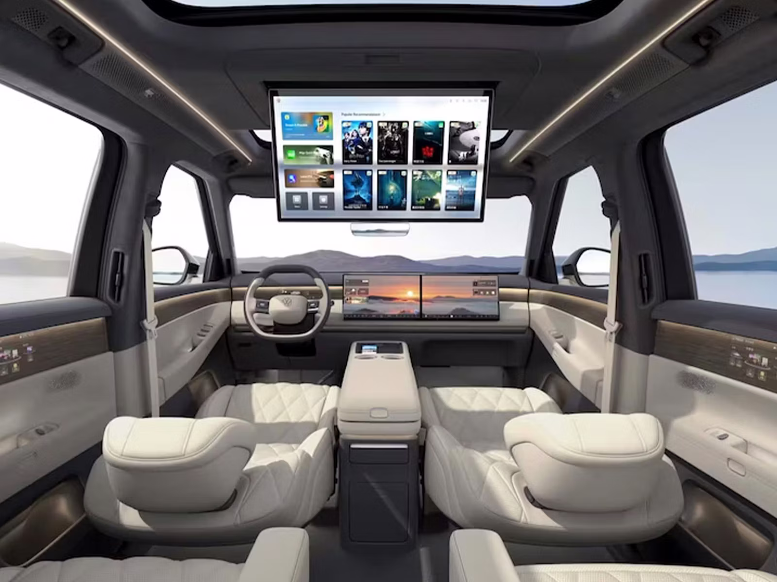 Pero lo más llamativo está detrás. Volkswagen ha convertido la parte trasera en algo parecido a un salón futurista, con superficies que pueden proyectar información en las puertas y una enorme pantalla de 21,4 pulgadas que se despliega desde el techo. El resultado es una experiencia casi de cine para los pasajeros traseros, que además cuentan con mucho espacio para las piernas y asientos individuales especialmente cómodos.