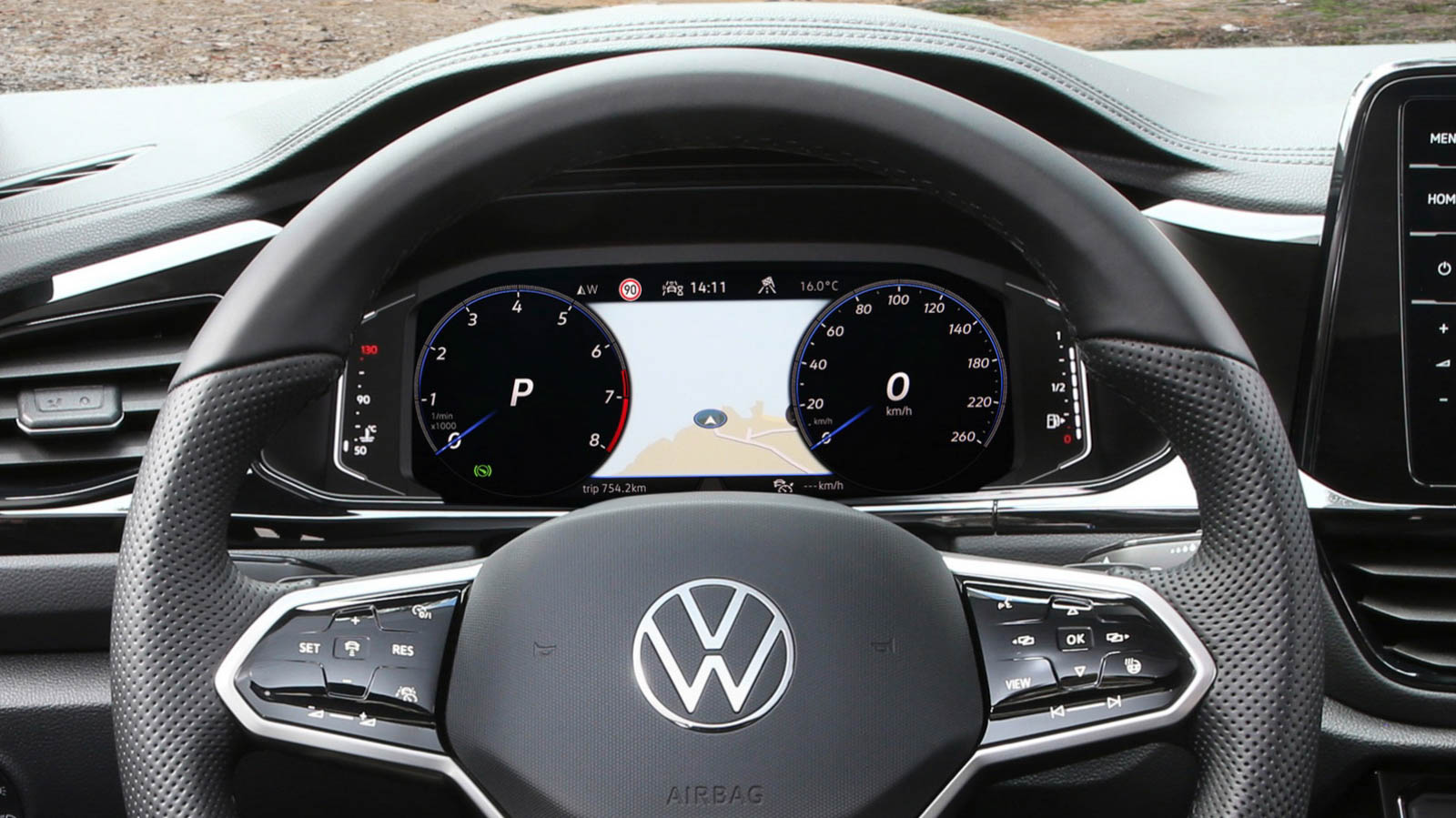 La instrumentación, cuya denominación es Digital Cockpit, siempre se visualiza en una pantalla. De nuevo, hay dos gamas distintas. Con el acabado Life, la pantalla es de 8 pulgadas, mientras que en el R-Line, es de 10,25 (Digital Cockpit Pro). No solo cambia su tamaño, sino que la pantalla grande tiene mayor resolución y permite configuraciones específicas para mostrar la información: en una de ellas, el navegador ocupa todo el fondo y los datos de la conducción van superpuestos sobre él.