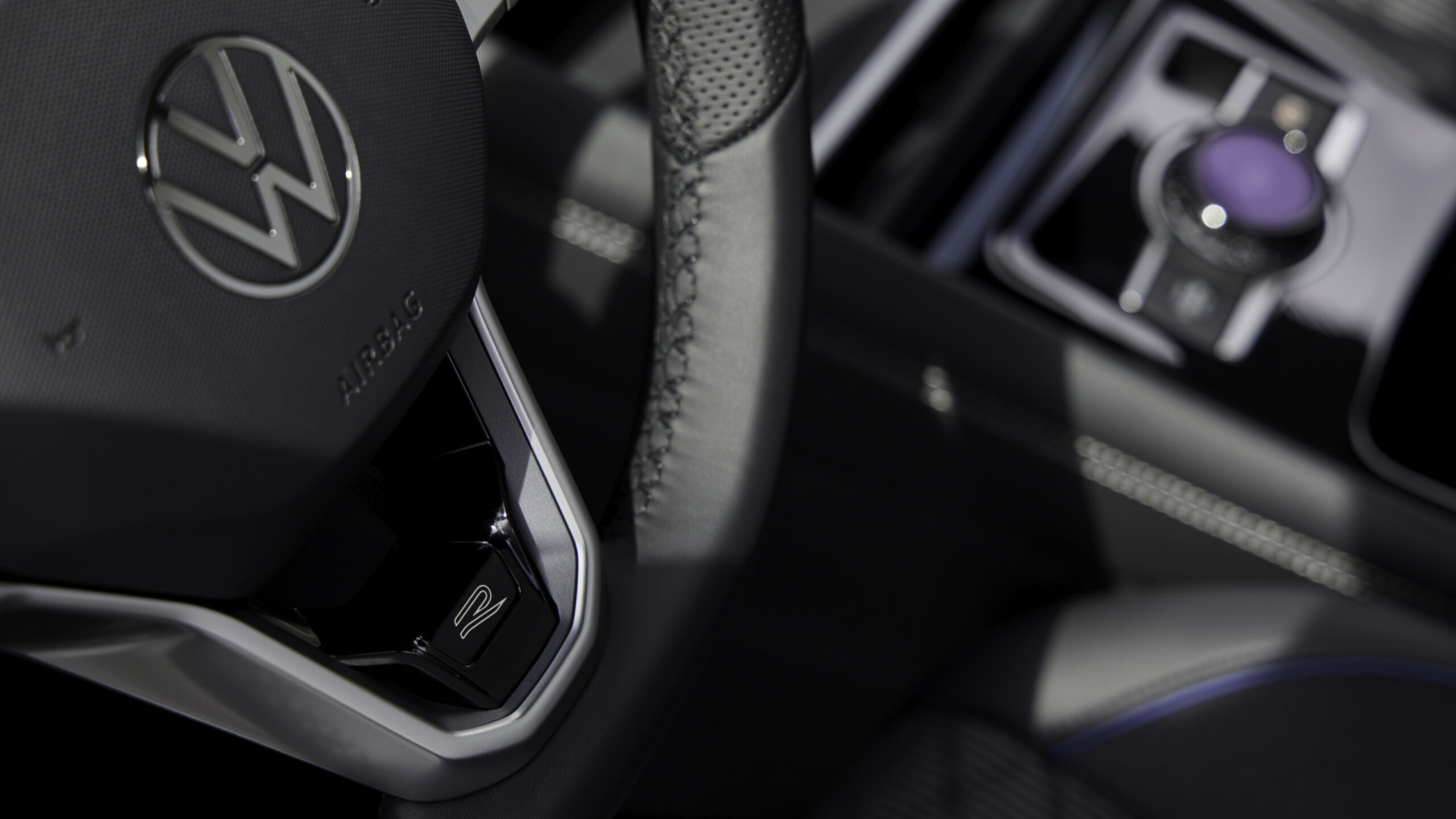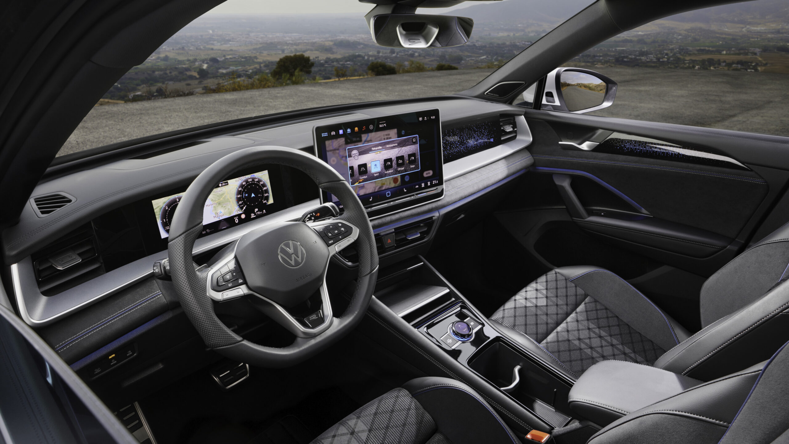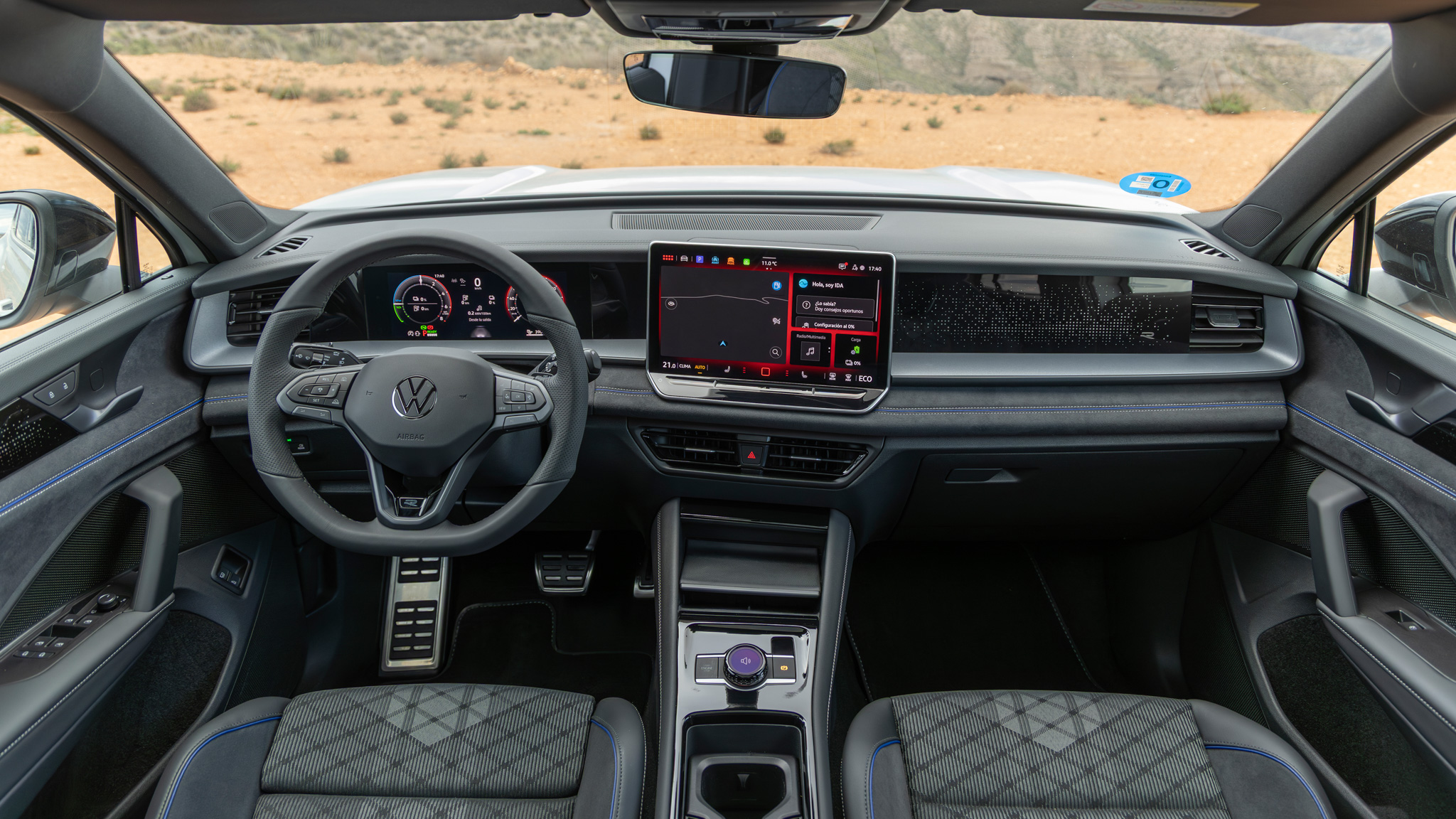 La calidad general de construcción es notable y los mandos están en una disposición ordenada. El salpicadero tiene un diseño ligeramente distinto al Tiguan, con un perfil horizontal que recorre todo el ancho, aunque mantiene gran parte de los elementos comunes como el volante, los paneles de las puertas o la consola central. La percepción de calidad es buena, especialmente gracias a las partes tapizadas en un tejido sintético similar a la piel vuelta en el acabado R-Line. En cambio, ciertos detalles como las molduras de plástico resultan menos sólidos al tacto.