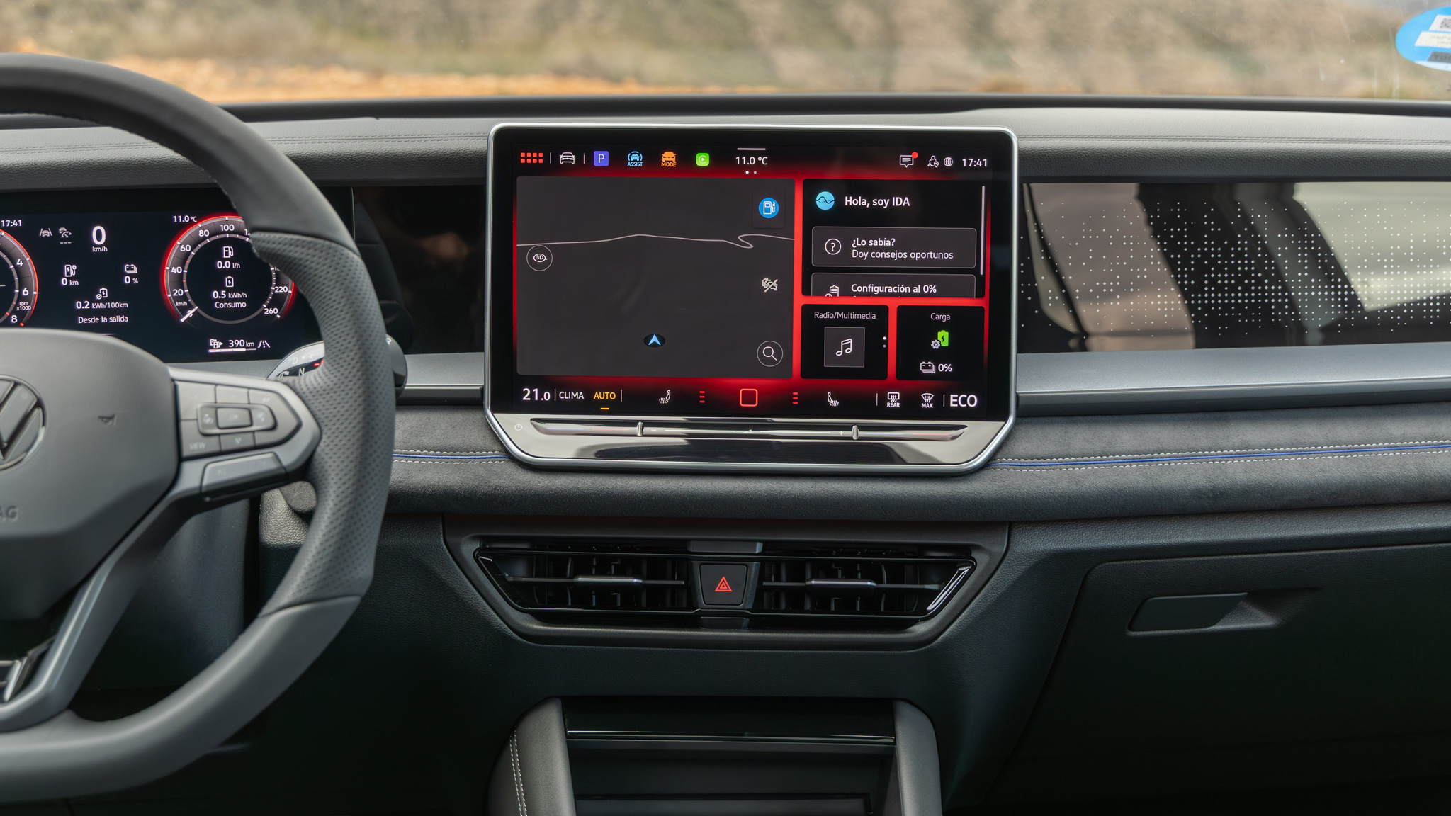 El sistema multimedia presenta una interfaz moderna, la cual me ha resultado considerablemente intuitiva, aunque los controles táctiles para el climatizador y el volumen me siguen pareciendo menos prácticos que los físicos. Como mejora destacable, Volkswagen ha reintroducido botones reales en el volante, lo cual supone un avance frente a los controles táctiles menos precisos de modelos anteriores como el Touareg.