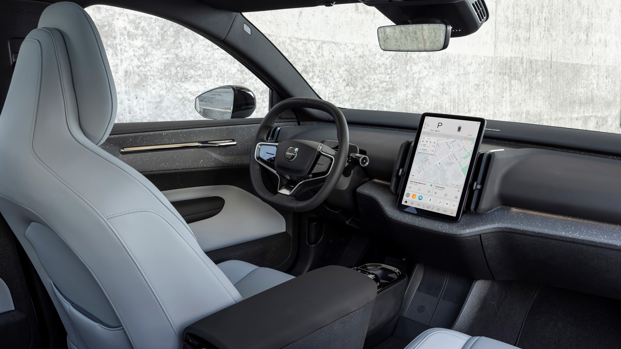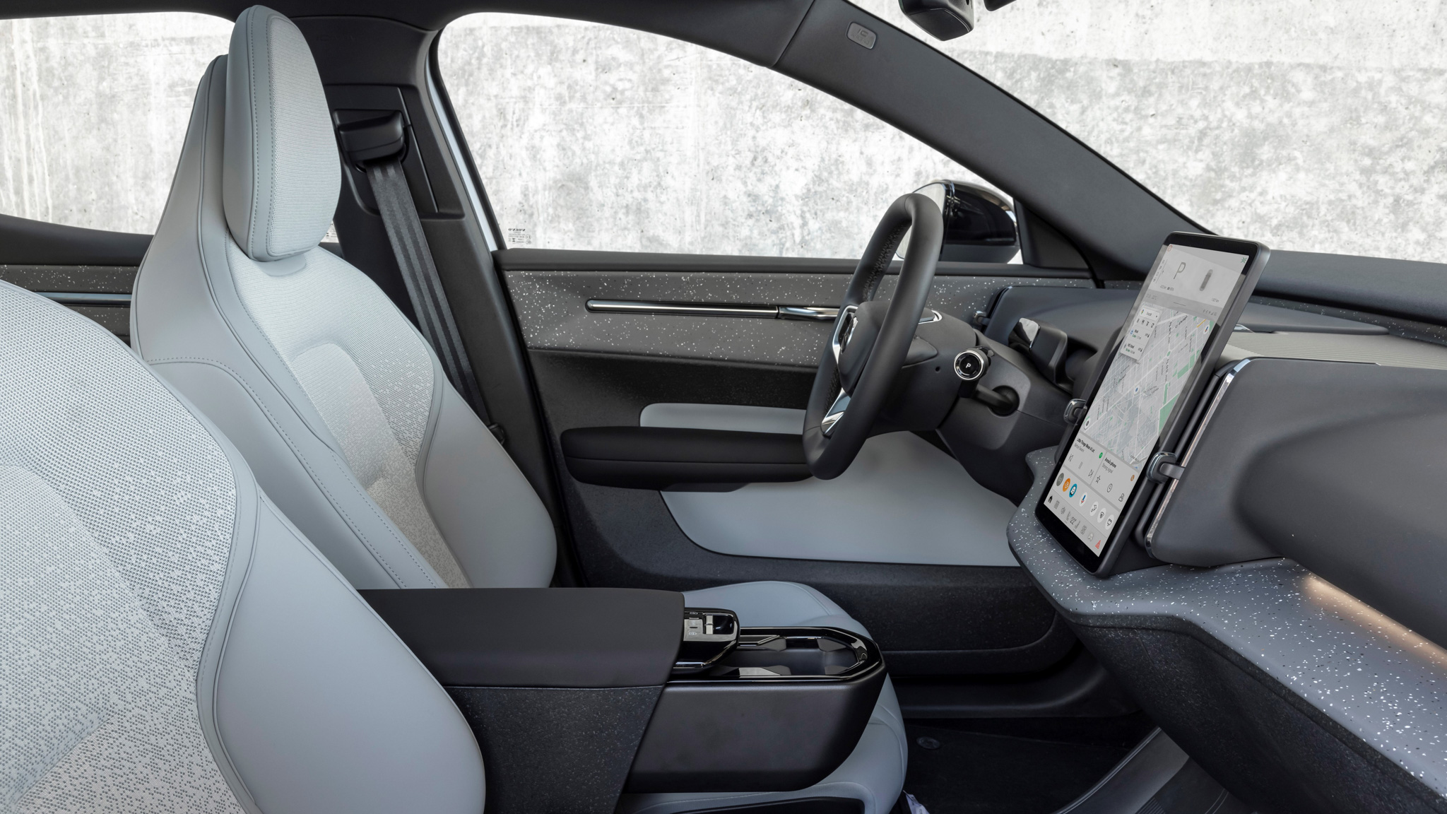 El habitáculo del EX30 está diseñado con un enfoque limpio y funcional, utilizando materiales reciclados como tejidos de denim y PVC. El salpicadero se caracteriza por un diseño minimalista dominado por una pantalla táctil vertical de 12,3 pulgadas, eliminando el cuadro de instrumentos tradicional. Esto, aunque visualmente atractivo, puede resultar menos práctico para algunos conductores, especialmente por la falta de botones físicos para funciones esenciales. El sistema de iluminación ambiental contribuye a una sensación moderna y sofisticada.